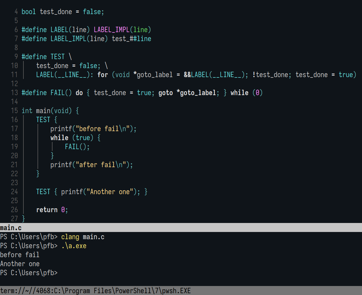 Поначалу думал, что в ассерте можно просто делать брейк, но потом вспомнил, что тогда не будут работать ассерты внутри циклов. В языке, к сожалению, нету меток для циклов, нельзя брейкнуться сразу на несколько уровней наружу. А метку для обычного goto никак не поставить: если рядом будут два теста, то они внутри одной функции создадут две метки с одним и тем же названием.