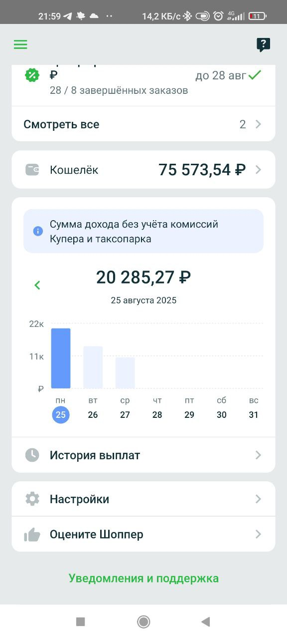 По циферкам. Рекорд за день, вроде, 24 августа - 20к за день. Помню ту смену, вначале шла очень хорошо, и я прям нацелился на 20к. Потом сильно замедлилась, и надежду на 20к я потерял. А потом, в последние часы, мне стали будто бы специально назначать заказы только с повышками, которые ещё и отдавали быстро. Сменка закончилась, денег было примерно 19750, и чтоб заработать недостающие 300 рублей, пришлось продляться на два часа, и ради одного заказа все эти два часа сидеть в краснопресненском маке. После того, как в нескольких чатиках я похвастался этим результатом, доходы резко упали, и я даже задумывался, а не специально ли мне разрешили столько заработать, чтоб попиарить сервис среди курьеров?