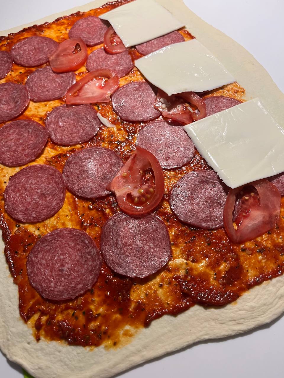 После того как раскатал тесто и сделал соус для пиццы. Смазываешь тесто соусом, оставляя 1-1.5 сантиметра корок с краю и вот так тесто с соусом ставишь в духовку разогретую минут на 5-7, что бы тесто чуть поднялось, а соус немного застыл. Достаешь, выкладываешь начинку (сыр там грибы колбасу и тд), а боковые корочки смазываешь слегка простым растительным (оливковым) маслом. И опять ставишь уже все допекаться ещё минут на 10 Тогда у тебя тесно никогда не будет под начинкой раскисшим и сыроватым, а корки будут чуть вкуснее.