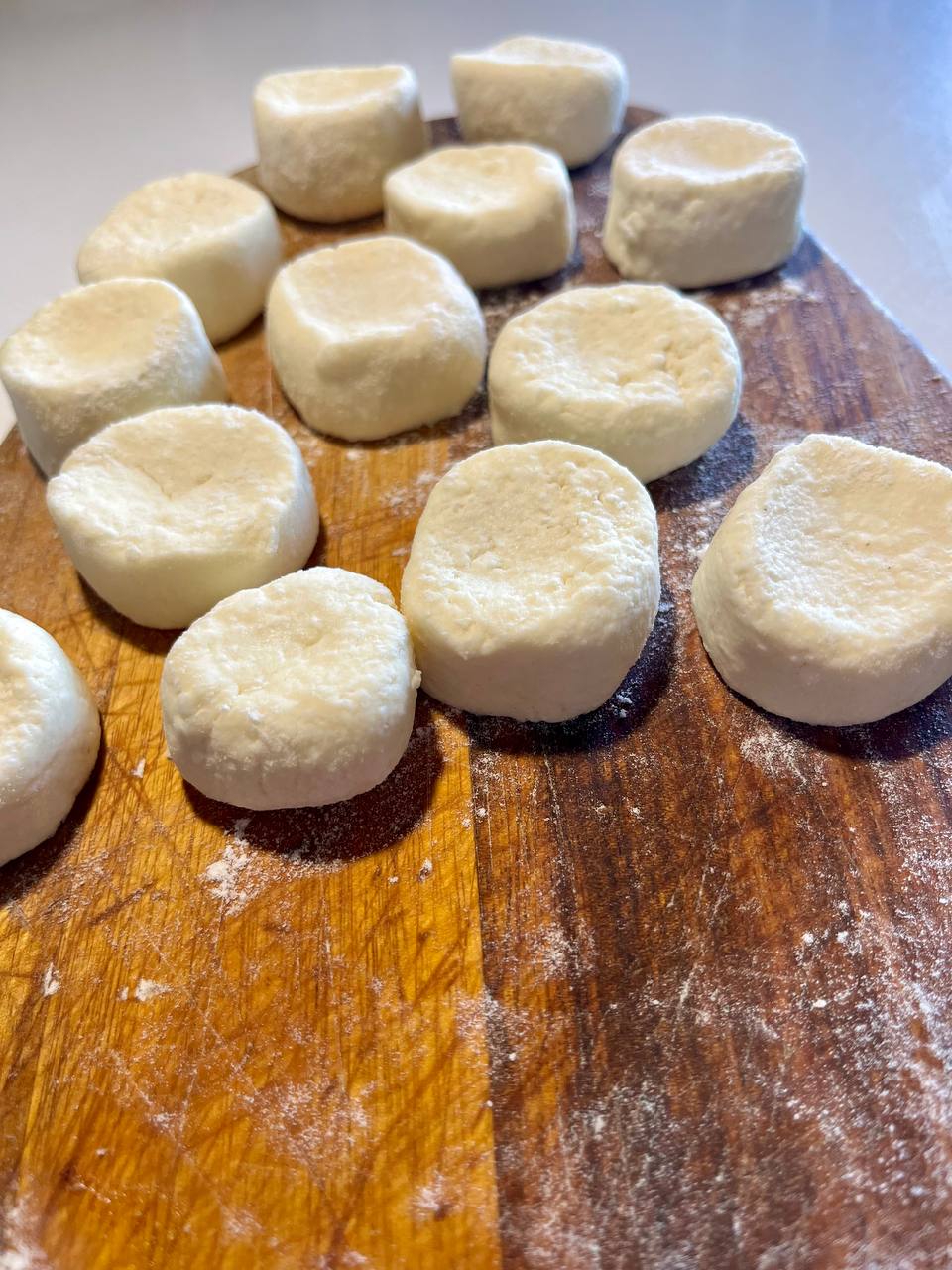 Тесто достаём, на хорошо припылённый стол, проминаем пальцами середину, формируем лепёшку... ну это вы и без меня умеете
