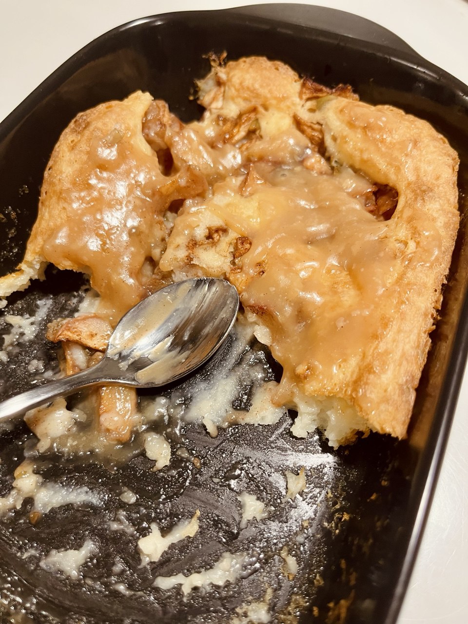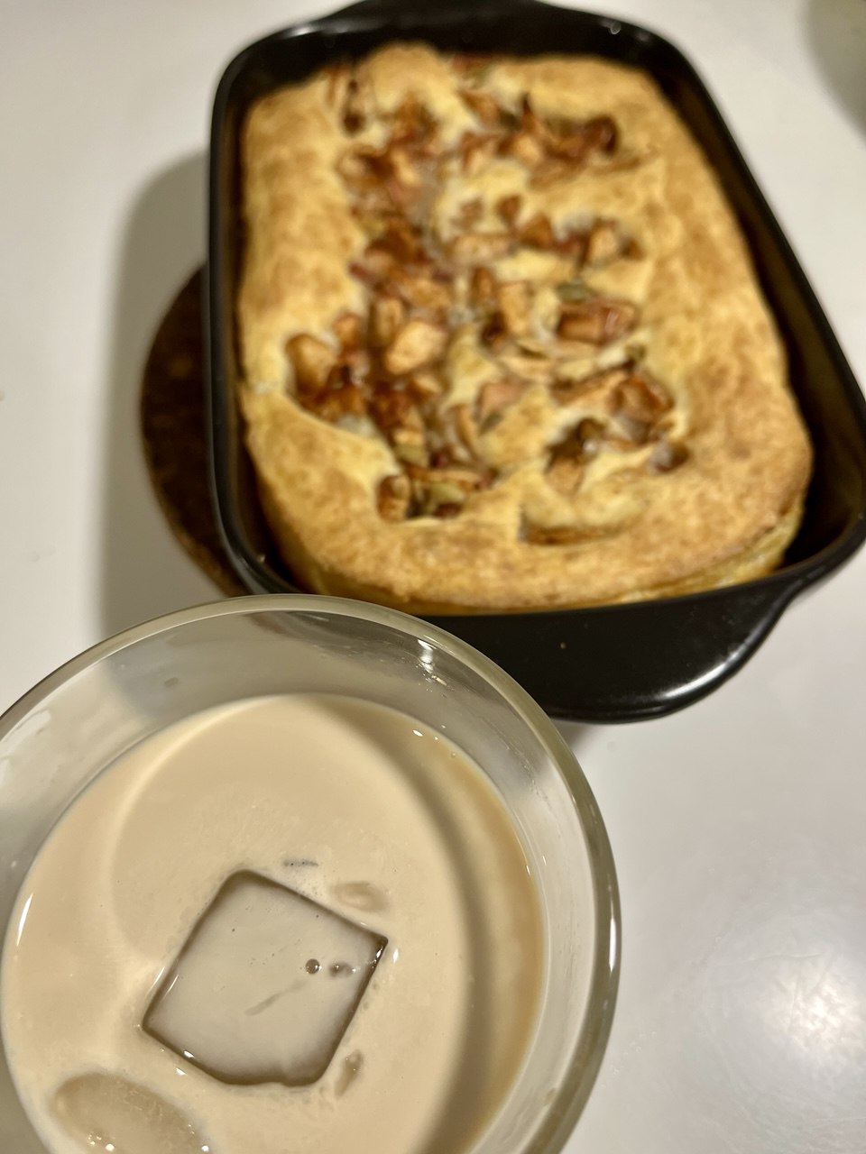 Достал форму (она горячая), влил тесто, сверху ± равномерно раскидал начинку (яблоко успело сок пустить) Ну и обратно в духовку на 40 минут, проверил зубочисткой - сухо, готово