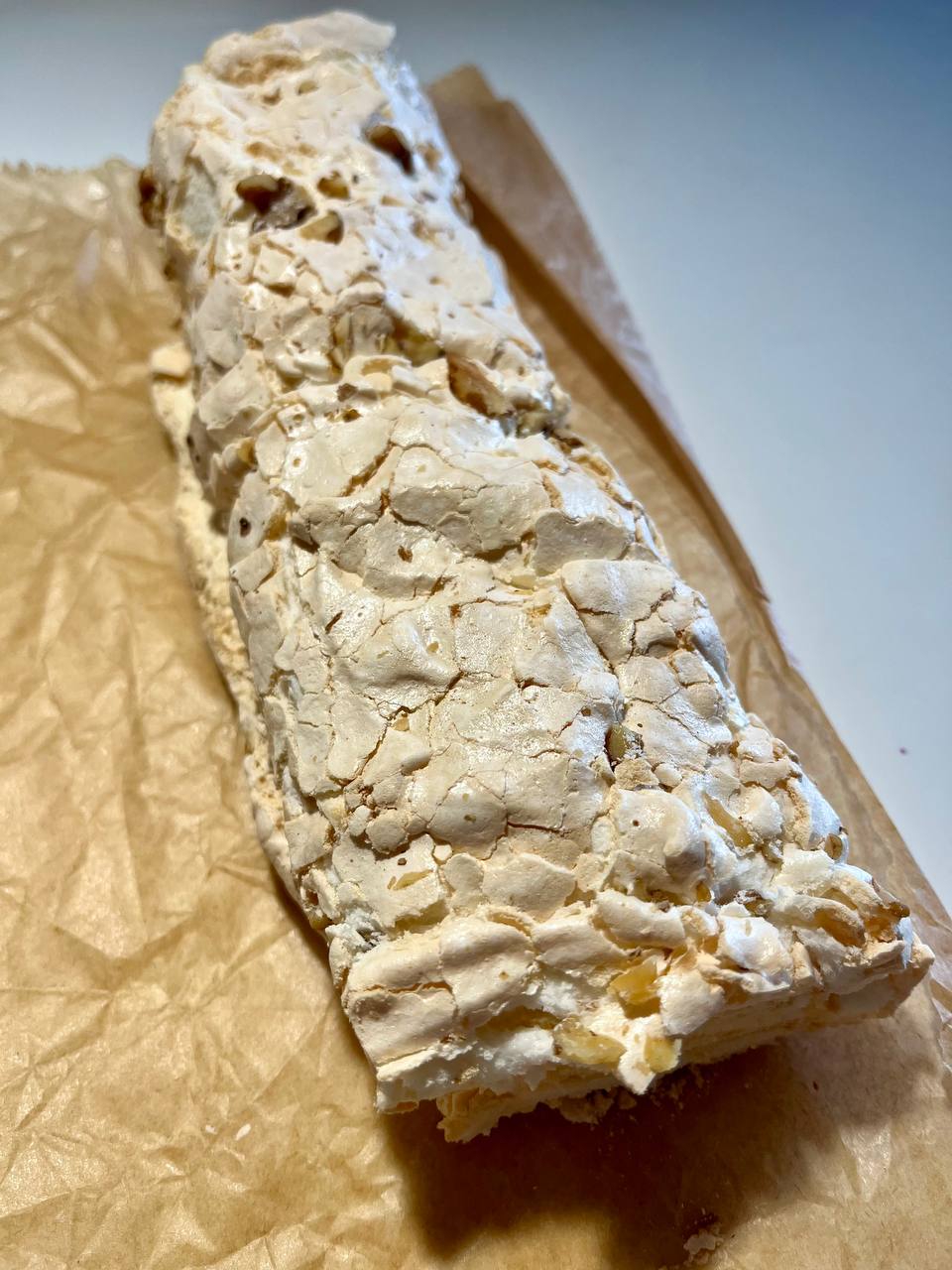 Выкладываем на силиконовый коврик, сверху хлопья орехов. Выпекаем корж на силиконовом коврике при 140с 30минут Достаём, остужаем, накрываем полотенцем или бумагой, переворачиваем. Покрываем начинкой Сворачиваем рулет. На 1-2 часа в холодильник
