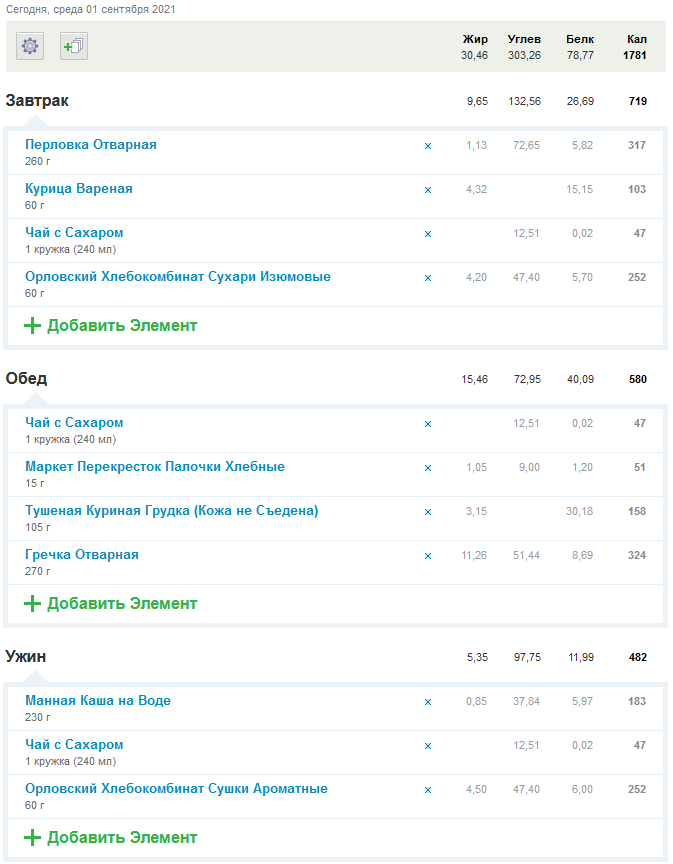 Чуть не забыл. Подставил читателей своего интересного бложика. Это то, что вчера сожрал. Плюс вечером примерно 150 грамм гречки с курицей, чтобы добить до 1800. Но вносить не стал.