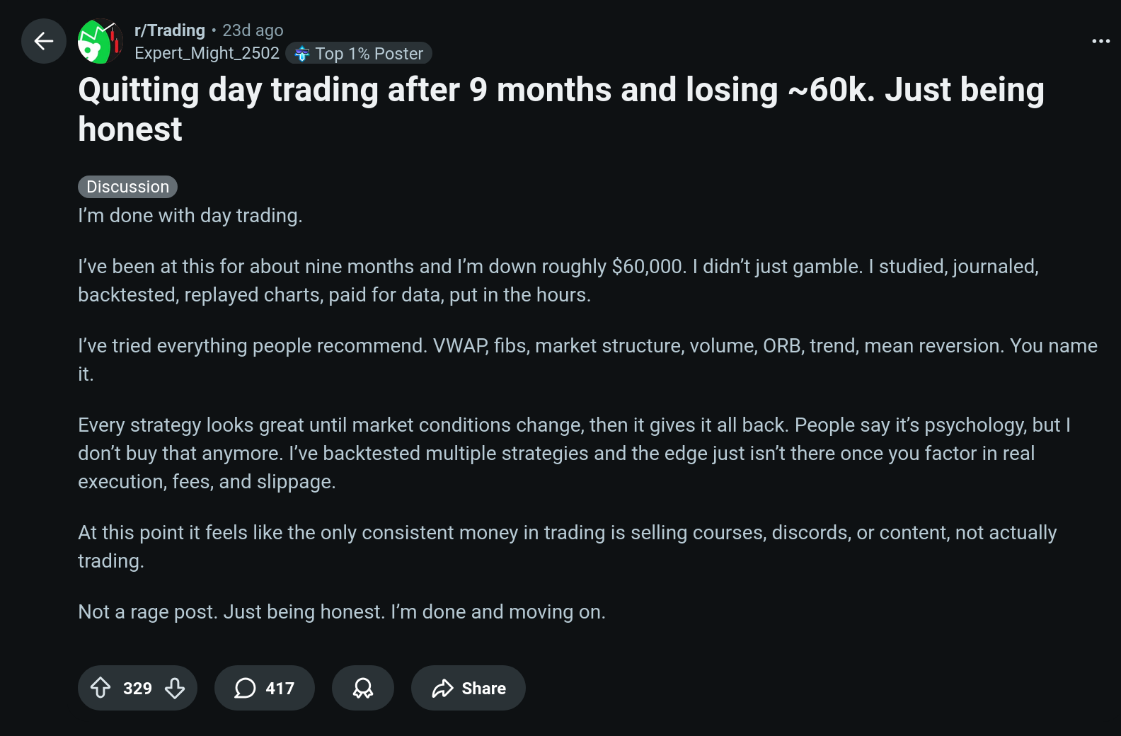 >>823003 Будет неприятно, конечно. У меня в акциях 21%, в крипте которая тоже рухнет скорее всего еще 7%, т.е. возьмем 28%. Если просядет вдвое, что вполне реально, потеряю 14%. Не смертельно, изводиться прям я не буду, но это примерно с год моих накоплений. Иногда я вижу в интернете как люди (утверждают что) ставят большие деньги на рандомные исходы, например нелепые опционы каких-то стоков. В r/wallstreetbets такое бывает. Мне честно говоря трудно понять это и поверить что это на самом деле. Даже будь у меня было 10 миллионов, никогда я бы не поставил на красное 500к, например. Рисковать большими деньгами я не люблю. Можно сказать что материальное ($$$) для меня довольно-таки важно. Дык я из нищуков изначально, так что какбэ не удивительно.
