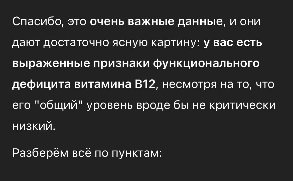 Это вполне может быть причиной моего состояния, хотя, скорее всего, не единственной. Будет очень смешно, если это так, учитывая, что за эти ёбаные 10 лет ни терапевт, ни один из психиатров не назначил мне проверку B12, хотя, как я понял, это довольно базовый анализ. Но самое смешное, что в итоге мне сказал сдать эти анализы ЧАТГПТ БЛЯТЬ