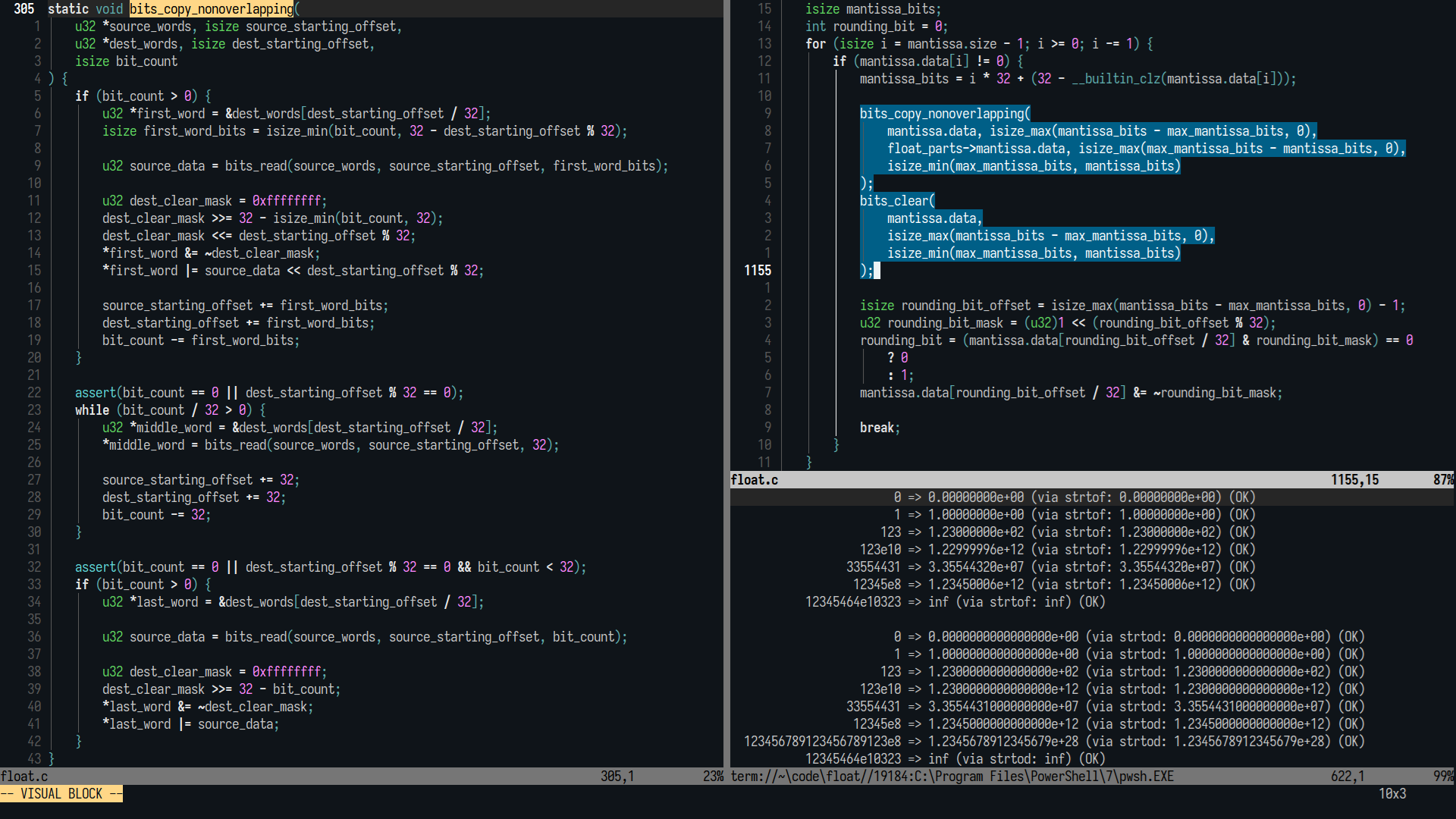 Единственное, я как-то поздно осознал, что для обобщёной функции float_parse (которая используется как для парсинга 32-битных, так и 64-битных флоатов) недостаточно знать только, сколько бит мантиссы ей нужно сгенерировать, ей нужно также знать минимальное значение экспоненты. Иначе, например, для даблов она всегда будет генерировать 53 бита, даже в случае денормализованных флоатов. То есть снаружи придётся округлять до меньшего количества битов, когда экспонента меньше минимальной, но это не получится корректно сделать, потому что выйдя из функции, ты уже потерял информацию о том, какие там были биты за пределами этих сгенерированных 53 бит мантиссы. Если что, под "сгенерировать N бит мантиссы" я имею в виду найти N-битное целое число с единицей в старшем бите, такое, что умножив его на 2^E, ты бы получил ~входное число.