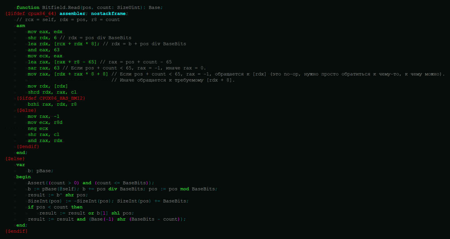 — Сдвигаем это число вправо на POS % 64 и маскируем младшие COUNT бит.