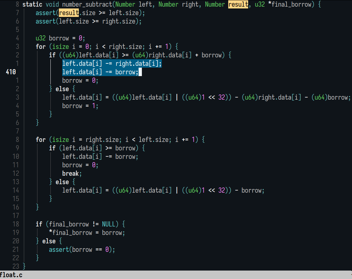 >>811063 Как будто дописал парсинг в том числе для дробных чисел, не особо проверял, но вроде работает. Там основная сложность для меня была - это длинное деление написать, а код его использующий - более-менее короткий получается.