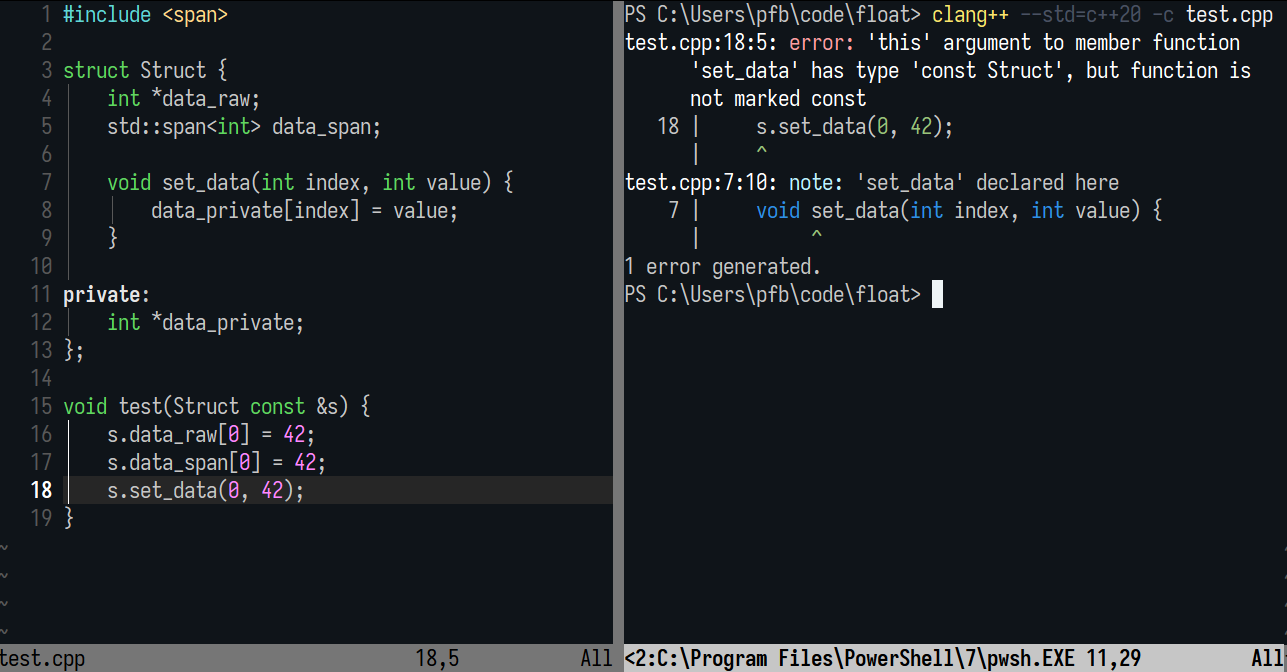 В си, понятно, тут ничего не поделаешь, но в плюсах, как оказалось, константная ссылка почему-то не спасает и единственный способ добиться ошибки компиляции - это завернуть доступ к данным внутрь метода или перегруженного оператора. Не знаю, почему так сделали, не вижу буквально ни одной причины позволять компилироваться коду на 17 строке на третьем пике.