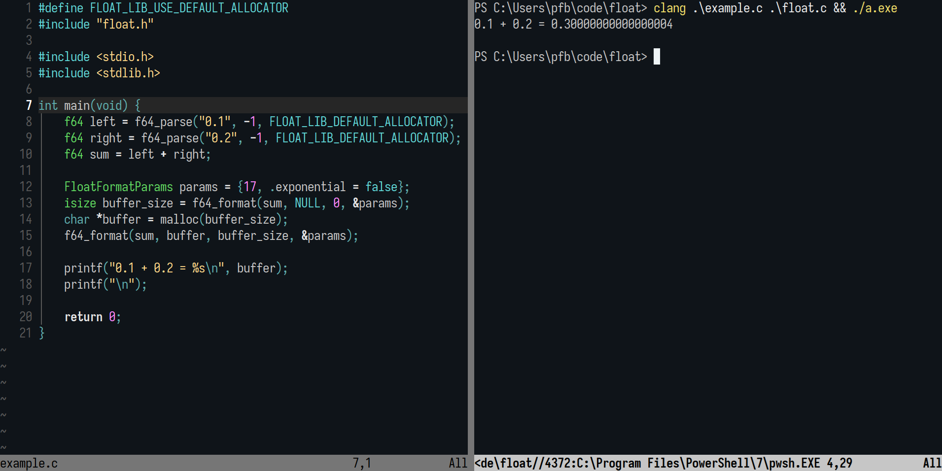 Вообще для печати ещё можно походу использовать double-double арифметику, по крайней мере так вроде бы делает stb_sprintf и в комментах автор пишет, что точности хватает для обратных преобразований во в точности изначальный флоат. Double-double арифметика - это, как я понял, такой хак, который позволяет числа с четверной точностью (но с тем же ренжем значений, как у даблов) реализовать через пару даблов, я не смотрел, как, но там вроде используется вот это: https://en.wikipedia.org/wiki/2Sum Через этот же приём можно уменьшить ошибку при сложении большого количества флоатов (Kahan summation), либо полностью устранить её (fsum из питона, но ему нужна дополнительная память).