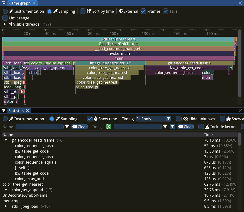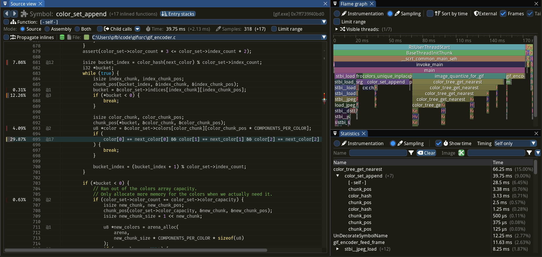 Ещё попробовал вот этот профилировщик https://github.com/wolfpld/tracy Как будто бы даже что-то показывает, например, то, что хешсет с цветами из входной картинки сильно тормозит из-за сравнения цветов по отдельным компонентам, типа, лучше было бы сравнивать их как 32-битные инты. Но в целом мне от него сейчас больше всего полезно смотреть соотношение времени выполнения разных этапов преобразования картинки в гифку. Он, кстати, вроде не только под винду, но и под линукс, просто билды готовые только под винду, то есть можно, вероятно, забыть про gprof, которым я так и не понял, как пользоваться.