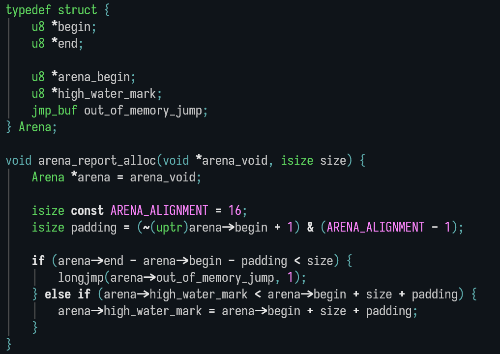 И ещё я выпилил определение структуры арены из хедера гиф энкодера и насрал воид звёздочками, чтобы пользователь (ну, то есть я сам) мог в своём коде определить структуру арены самостоятельно и при необходимости добавить в неё какие-то свои дополнительные поля. (Да, чисто технически это UB, но мне так всё равно.) Главное, чтобы в начале были указатели на конец и начало куска памяти. В этом же хуке можно ещё, например, решить, что делать, когда закончилась память: аборт, лонг джамп, либо, возможно, даже расширить память, передвинув end указатель вперёд? Ограничение состоит в том, что трогать begin никак нельзя, то есть, например, нельзя подсунуть новый кусок памяти, когда старый закончился. Чтобы можно было всё же совать новую память, пришлось бы, наверное, также определять аналогичные хуки перед arena_snapshot и перед arena_rewind, что уже звучит как переусложнение.