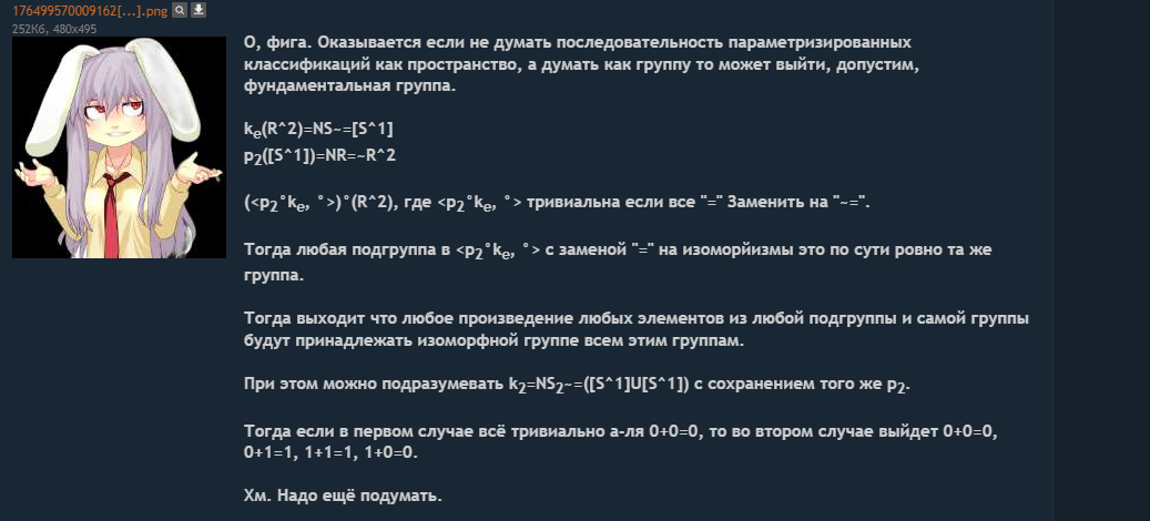 3.Комбинированное, а точнее как пример и на что пока буду смотреть - статика->динамика->статика, где модель этого надо начинать делать с динамики. В целом это про то, как статикой понять то, как прийти к тому простому, что нужно "уничтожить", чтобы изменить или само то пространство или пространство законов(и может его тень) для того, чтобы либо иметь может быть другие траектории но точно в другом пространстве или же чтобы точно иметь другие траектории в том же пространстве. При том да, пространство законов траекторий это про переходы между законами. Тень её - понятно что. Граница/цикл/гомологии и давайте менять(Для примера у физики переходы между законами можно в целом считать одномерными как интервал (0,бесконечность). А всё это по той причине, что законы для траекторий всяких вещей задаются в пределах объема/площади какого-то куба или гомеоморфизма шара. И при том разницы между кубом или квадратом не будет в таком смысле - т.е в целом про гипер-кубы и шары там, диски. Но при этом можно теоретически и сказать что законы у физики не только по площади идут, но и может по времени. Типо вначале вселенной законы другими были и вот вся эта хрень. Но я не, ха-ха, ШАРЮ. Ну это как пример.).