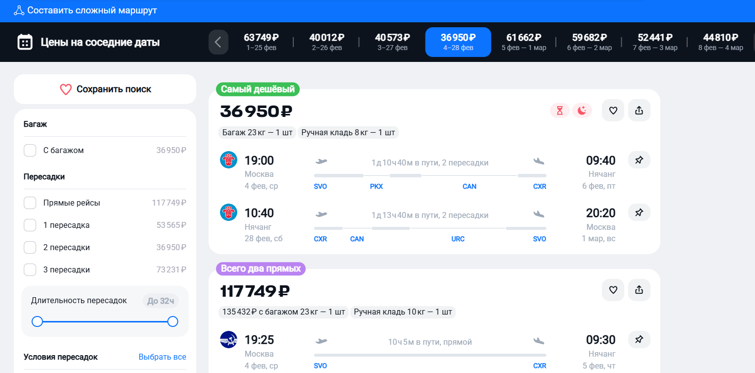aviasales вроде самый нормальный сайт для покупки билетов, я понял что вариант только аэрофлотом лететь, потому что у него есть обмен (платный) и он единственный кто летает прямо. с пересадками и повторными регистрациями можно запутаться и приобрести неприятности.