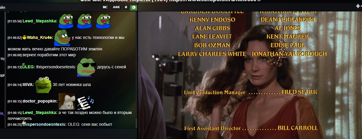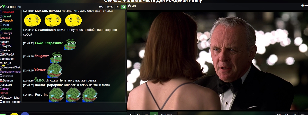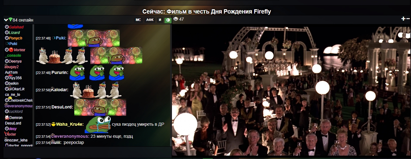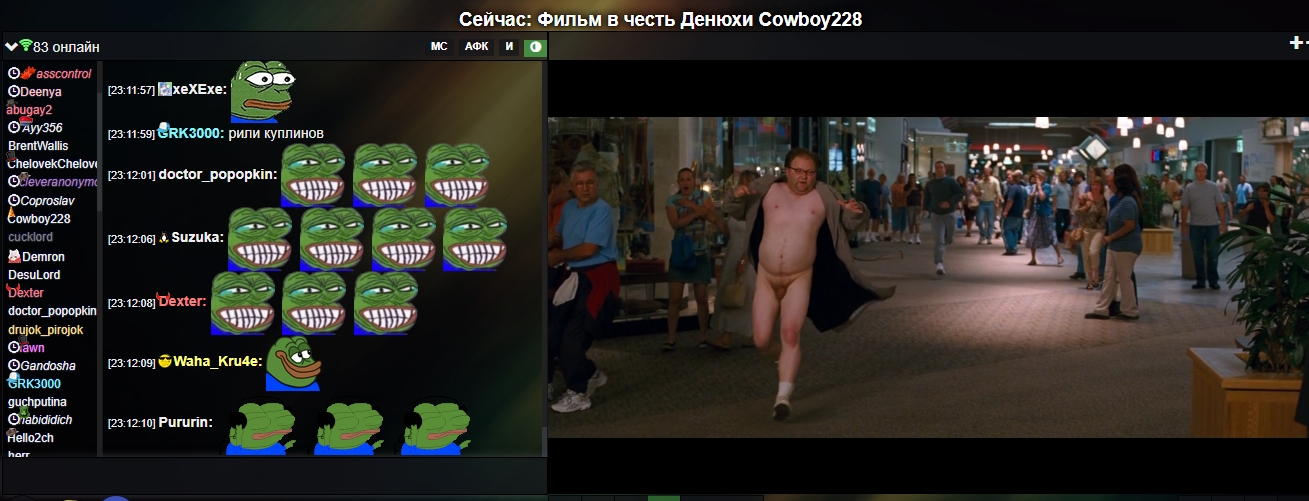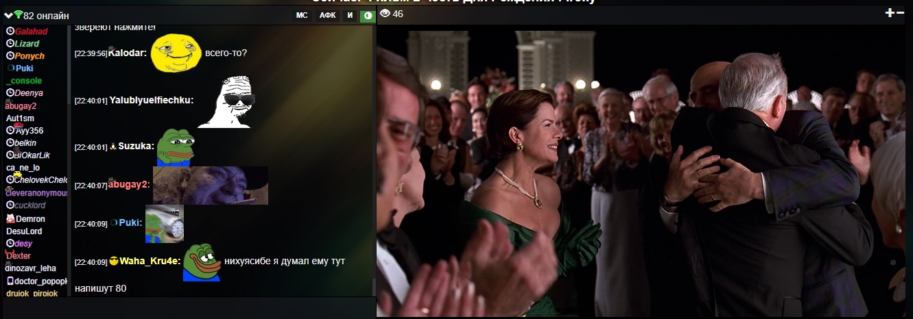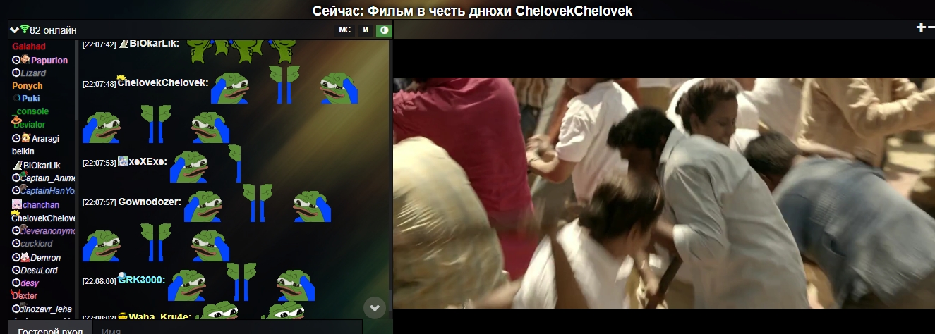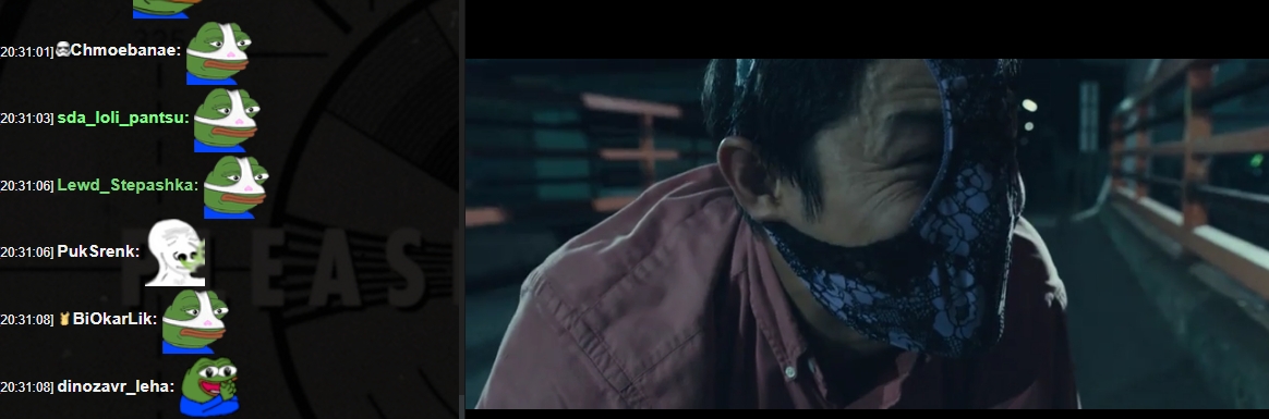 Онлайн не рекордный, но обычно в районе 120. Выходит, поистине народное кино уровня Бэ. Разница в реакции чата по сравнению с американским, конечно, кардинальная.