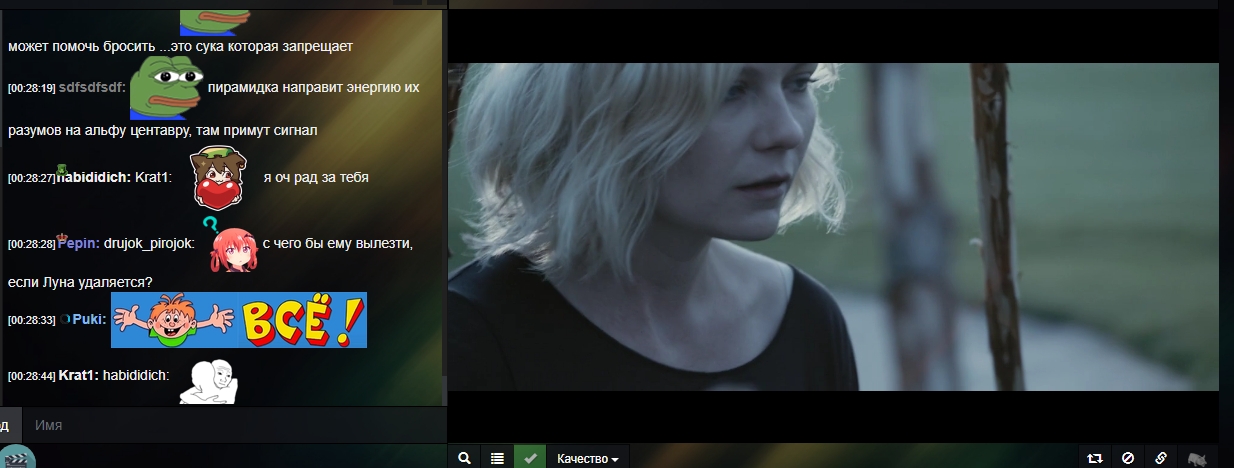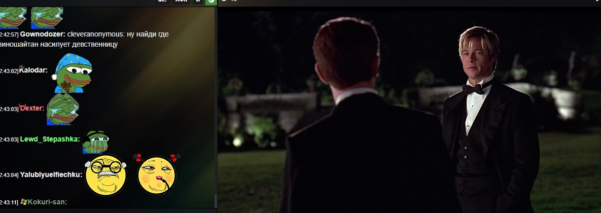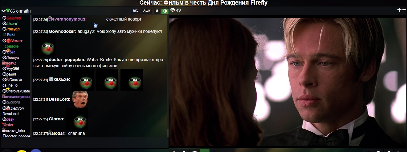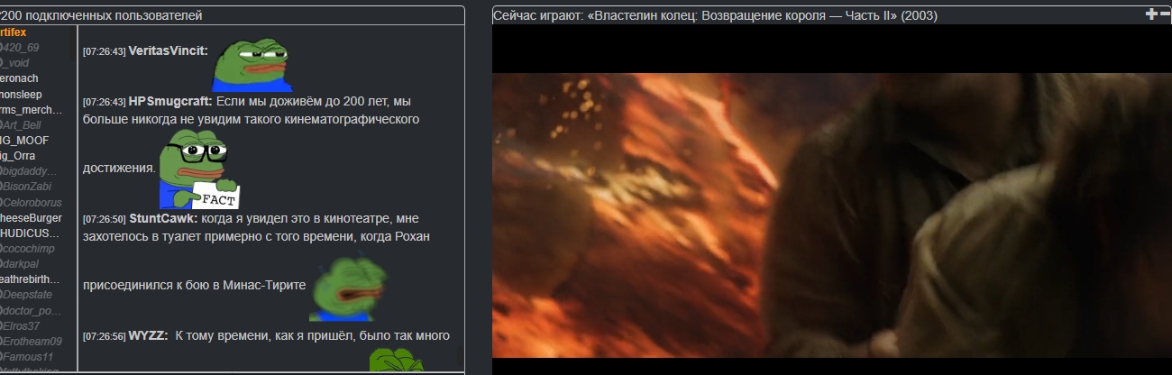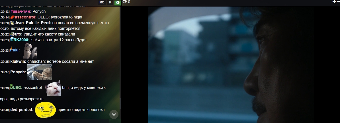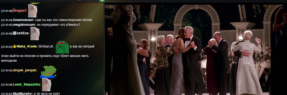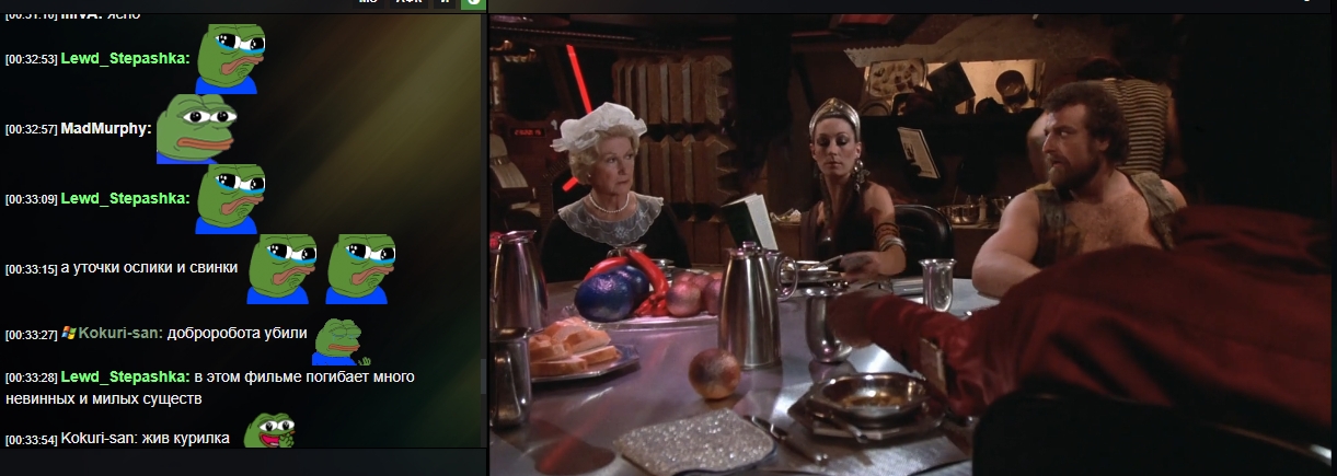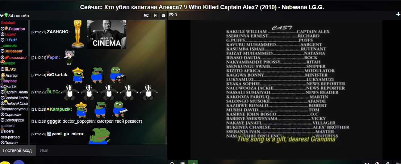 Онлайн не рекордный, но обычно в районе 120. Выходит, поистине народное кино уровня Бэ. Разница в реакции чата по сравнению с американским, конечно, кардинальная.