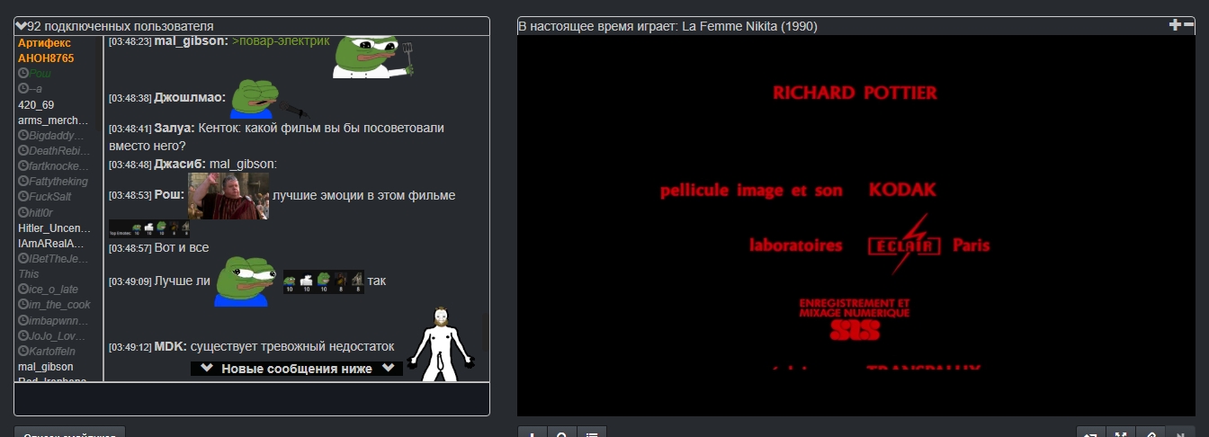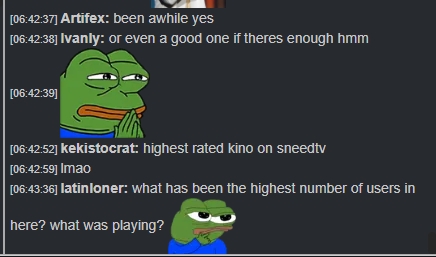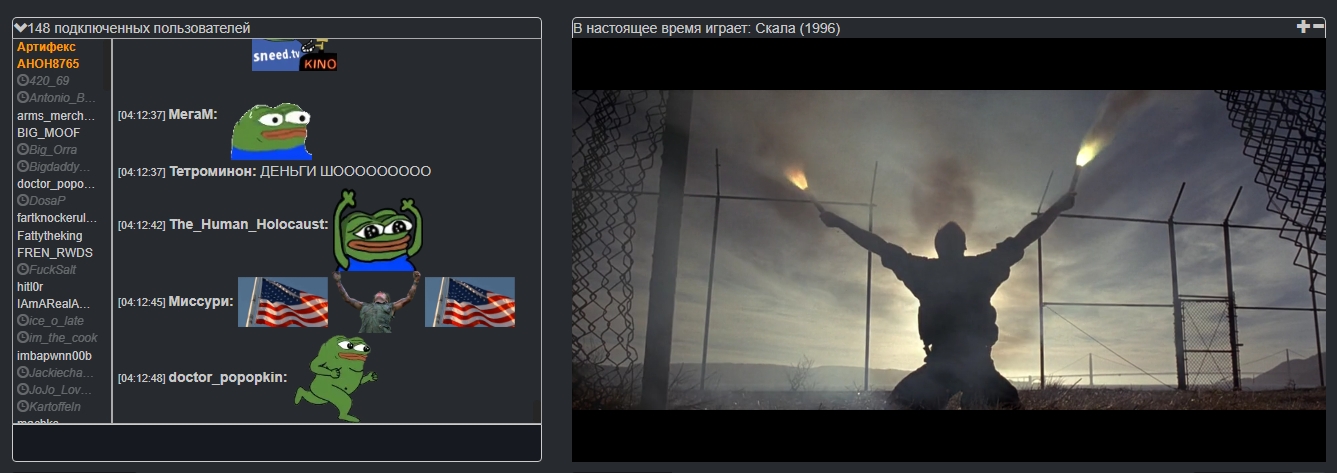 Снидач https://www.cytu.be/r/sneedtv Сейчас главный регулярный англоязычный Мувач. Ежедневно, начиная с 23.00 (иногда с 20.00) по Мск, показывает по 4-5 фильмов, объединенных в темы. Голосования нет, реквесты (сразу по 4, подобранные в соответствии с общей темой) кидаются в личку админу под ником Artifex. Есть институт ДР (Дней рождений), когда посетитель может кинуть любые 4, 5 или 6 фильмов без общей темы. Раньше назывался tv-movienight, но сменил комнату, предположительно, из-за захвата канала. Рекомендуется тем, кто хочет подучить английский. Отличается ламповой атмосферой без тивачерской токсичности и отсутствием цензуры на фильмы.
