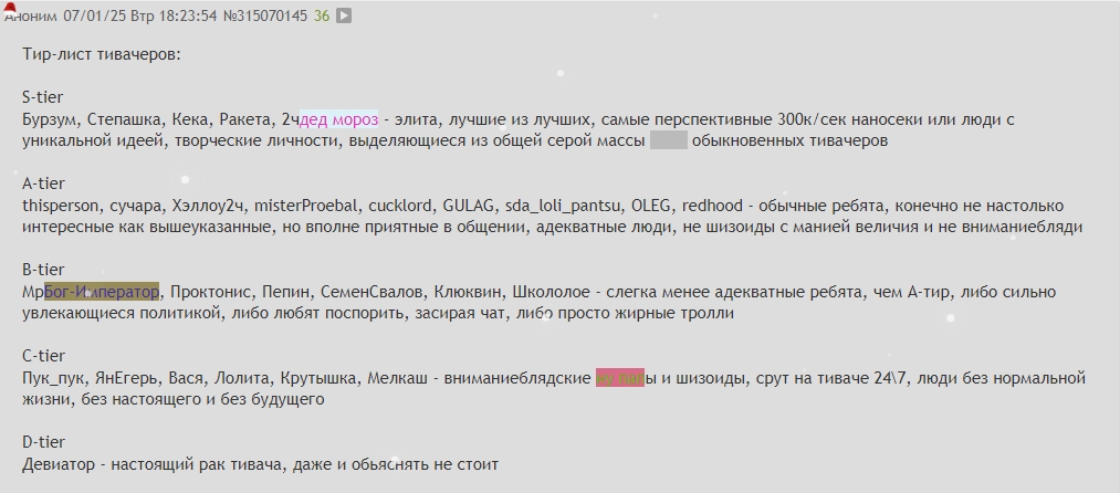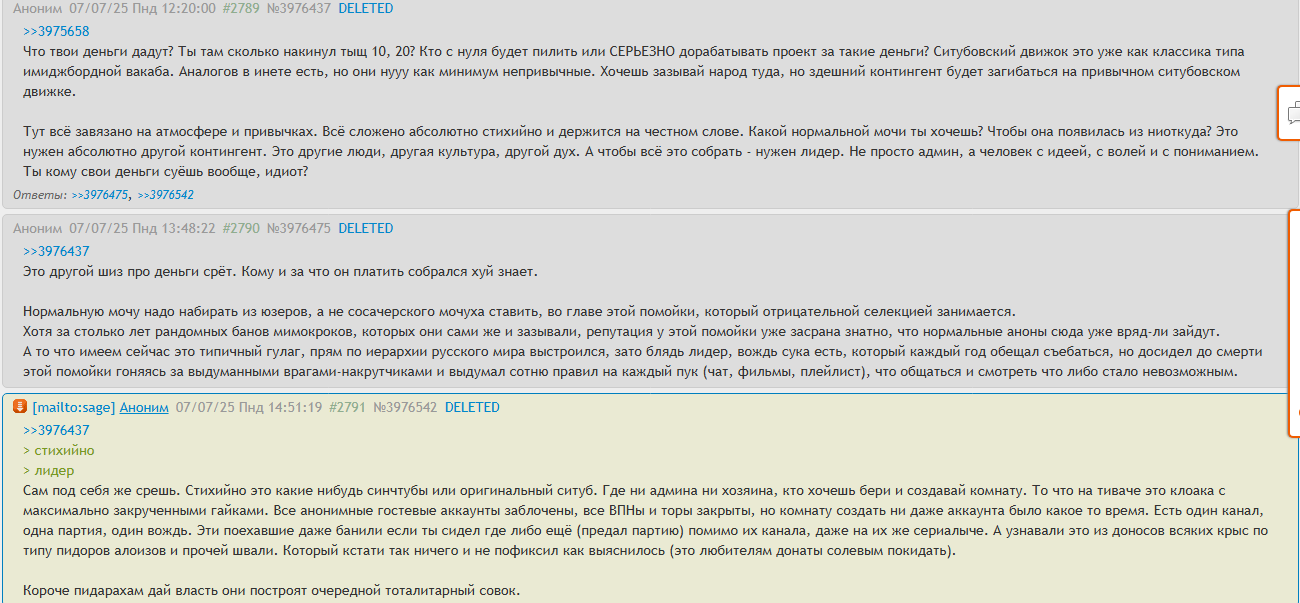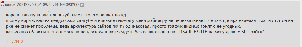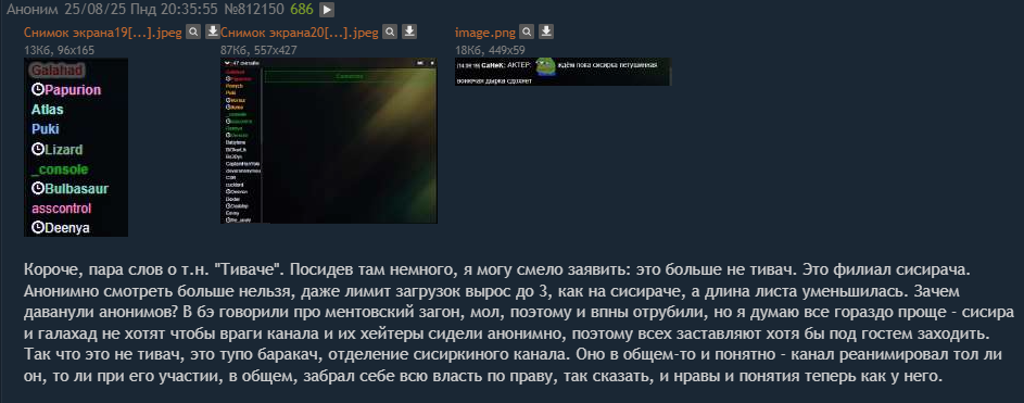 Не знаю кто слил тред админам. Но я так скажу - у меня есть своя группа в дискорде и мне туда мои корреспонденты шлют скриншоты. С 16 года я сижу на Тиваче, а за последние 5 лет сумел собрать свой штат неравнодушных информаторов.