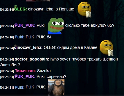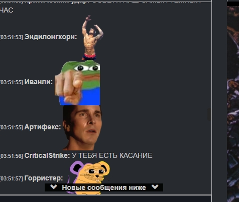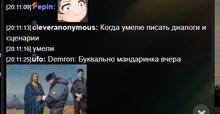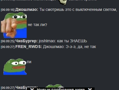 [06:47:25] DreadRaziel: Artifex: /gigakek мы просто выкрикиваем теги эмоций во время фильма [06:47:25] Ночной круиз: lel [06:47:26] ЧизБургер: что, если бы вы были окружены девушками, которые не были бы вашей девушкой, и они сказали: «ЕСЛИ ТЫ ПРИКОСНЕШЬСЯ КО МНЕ, МОЯ МОЯ ДЕВУШКА», но они продолжали кружиться все ближе и ближе, и утиный ролл не сработал. [06:47:27] Артифекс: /jej [06:47:29] DreadRaziel: ХЛОПУШКА [06:47:31] ЧизБургер: /shake