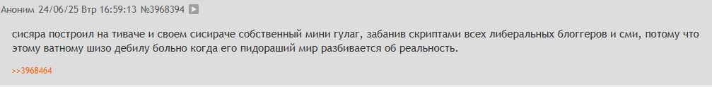 Пуки на днях порвался и грозил забанить Крата за то, что тот "заспойлерил" ему фильм Анора. А Крат всего-то сообщил, что фильм разгонится лишь с 45 минуты. Этого хватило, чтобы порвать Пукину попу. Вахтер грозил, что даст Крату пермач и будет банить все время, как только того будут разбанивать старшие модеры. Галахад конечно проглотил. Предлагаю называть Пуки Дон. Чувак откровенно шатает Тивач, ведя себя так, будто он старший, и ломая систему сдержек и противовесов, а админы лебезят перед ним. Интересно, как далеко он зайдет. Прости, степашка, но тебе придется потерпеть