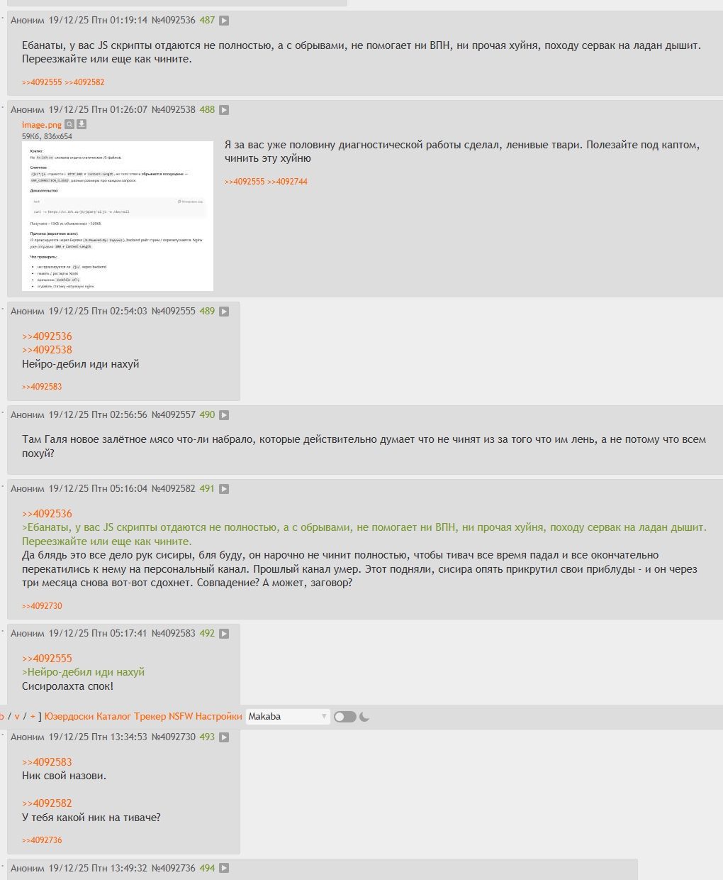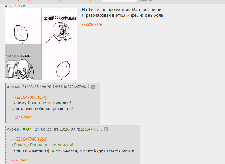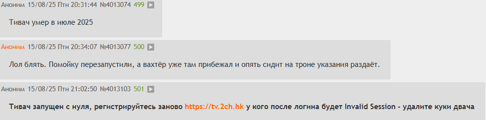 На Тивач всем похуй, Абу даже не знал, что он еще работает, поэтому на выебоны мочи админам тем более плевать. Вспоминаются слова дискордной мочи - "скажите спасибо Галахаду, что он вообще тут сидит",когда ей на него пожаловались. Галахаду, конечно, спасибо, но ситуация грустная Тивачеры и их модеры - прямо как 9 легион, который остался в Британии и все на него забили. А вместо бриттов - баги и бесконечные поломки. Тивач подобен дрейфующему в космосе комическому кораблю. От него отваливаются куски, метеориты дврявят борт все сильнее, а латать нечем.