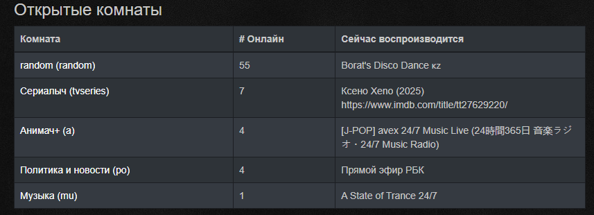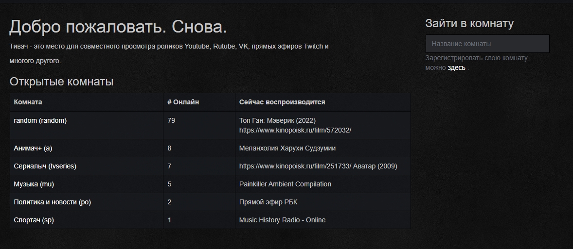 Вифоси (v4c) https://www.cytu.be/r/v4c Американский Тивач. Основной репертуар: мемы, короткие видосики, смищные видео и т. д. За последние несколько лет начал показывать и фильмы с передачами (раньше их крутили на связанном канале под названием m4c, но тот почти умер после появления Снидача). В 2019 году подвергался нападению тивачеров из-за ограничений в отношении русскоязычных видео. Обладает развитой инфраструктурой, которой Тивач достиг лишь в последние годы. Не очень приветлив к иностранным видео.
