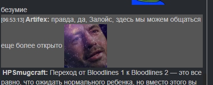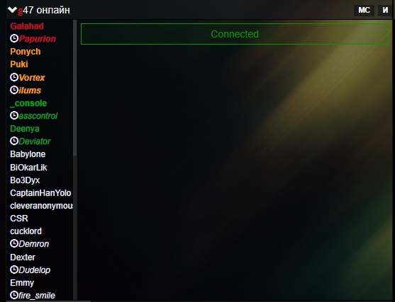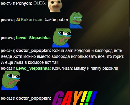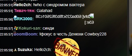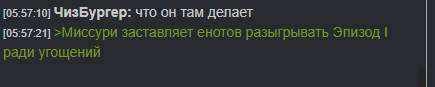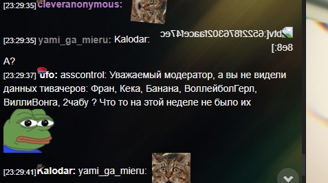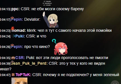 ЦСР (Сисира) тоже проявлял себя не с лучшей стороны - к примеру, одно время он запрещал экс-моду Девиатору постить смайлы с бурятками просто потому, что они ему не нравились. Весьма обидчивый и в приступе гнева может забанить насмерть. Но он, хотя бы, отвечает за работу движка и научил пользователей вставлять картинки в чат. В первом полугодии 23 поссорился с Галахадом и запилил отдельный канал, отключив на рандоме весь функционал. Довольно жесткий тип.