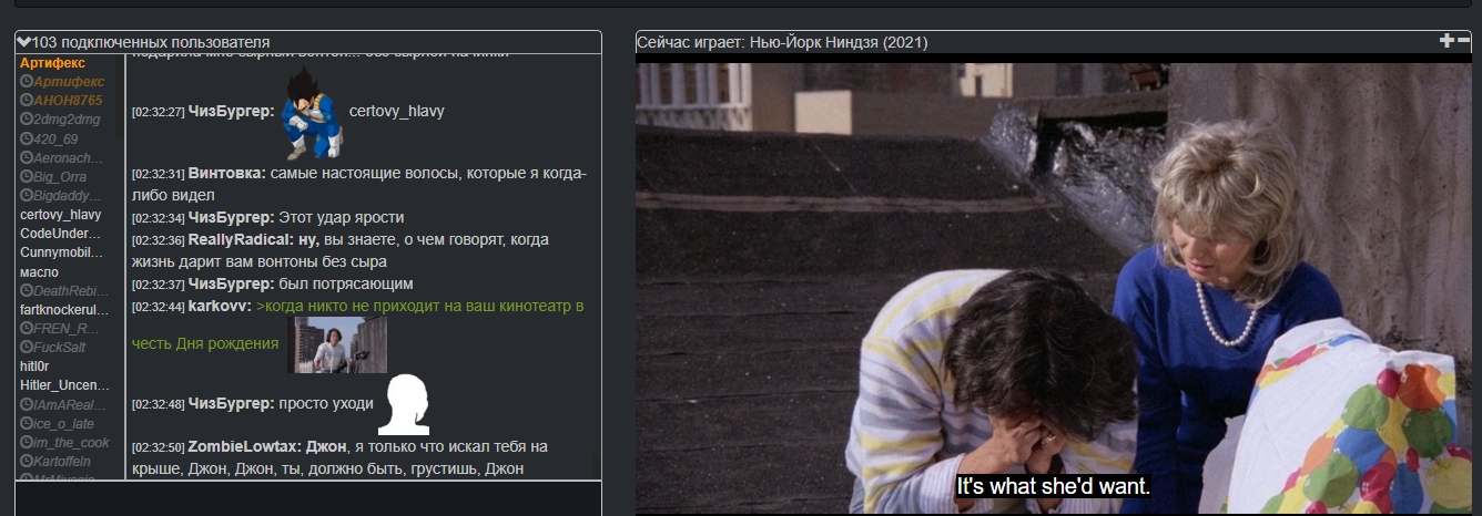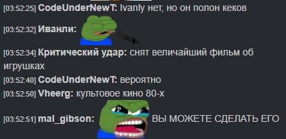 [06:47:00] Кенток: Держу пари, начнется драка [06:47:06] FREN_RWDS: Я думаю, что встреча SneedTV сработала бы, если бы мы арендовали кинотеатр Artifex: DreadRaziel все встают и кричат КИНО во время хороших сцен /kinokino [06:47:13] FREN_RWDS: и у нас было несколько показов одновременно
