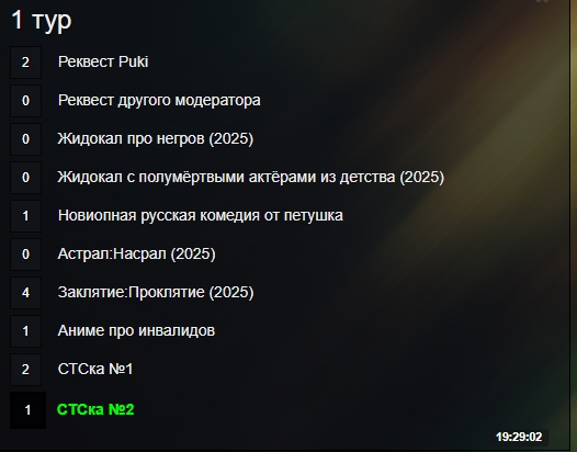 Девиатор вынужден юзать анальную рулетку и заворачивать реквесты из-за нытика и вахтера Руки, который прошлой осенью устроил истерику из-за того что победил арт-хаусс хуями, и недавно тоже вонял из-за победы фильма про космос