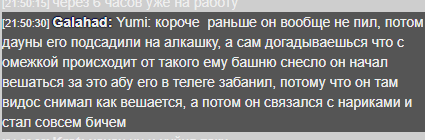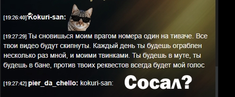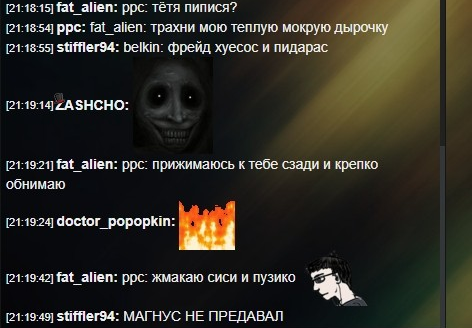 Какое ламповое место? Когда так было? Кровавая моль Галахад мстит Ракете за то, что тот агитировал за фильм не запрещенный в РФ, удаляет его стикеры, а потом банит его друзей за то, что посмели эти стикеры перепостить. Другой админ кинул бы в Блек лист фильм или просто не дал бы его ставить, а задним числом мстит только зашуганная моль, кухаркин сын, которого в школке обижали. А вчера я узнал из чата, что он забанил еще и Степана, блядь. За что? Я хз, наверно опять из-за меня. Он небось думает, что я не могу сидеть под другим акком или вообще анонимно и делать эти скриншоты. И на пике этот пожиратель гороха (анусом) говорит, что слишком он добрый. ЗАБАНИЛ, СУКА, ПО БЕСПРЕДЕЛУ, ТУПО НИ ЗА ЧТО - НО СЛИШКОМ ДОБРЫЙ, ВЕДЬ РАЗБАНИЛ ЖЕ. Пиздец.