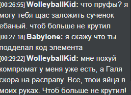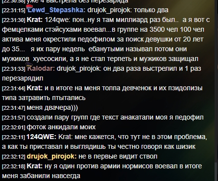 [19:44:25] Puki: CSR: давай забаним эту гнилую крысу раз и навсегда за пиздёшь [19:44:47] CSR: Galahad: да за такой пиздежь не видать ему модерки [19:45:56] CSR: Galahad: этот крыс сам удалил акк чтобы обвинить меня что я снял [19:46:04] CSR: Galahad: такое не прощу