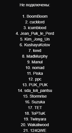 >>724097 Что интересно - Беспредел им не особо зашел. Там было 80-85 рыл, но из них человек 10 с тивача. Тут 75, но я почти никто с тивача не завлек, потому что ушел с него и не мог оперативно провести агитацию, и сидевшие в чате реагировали намного живее.