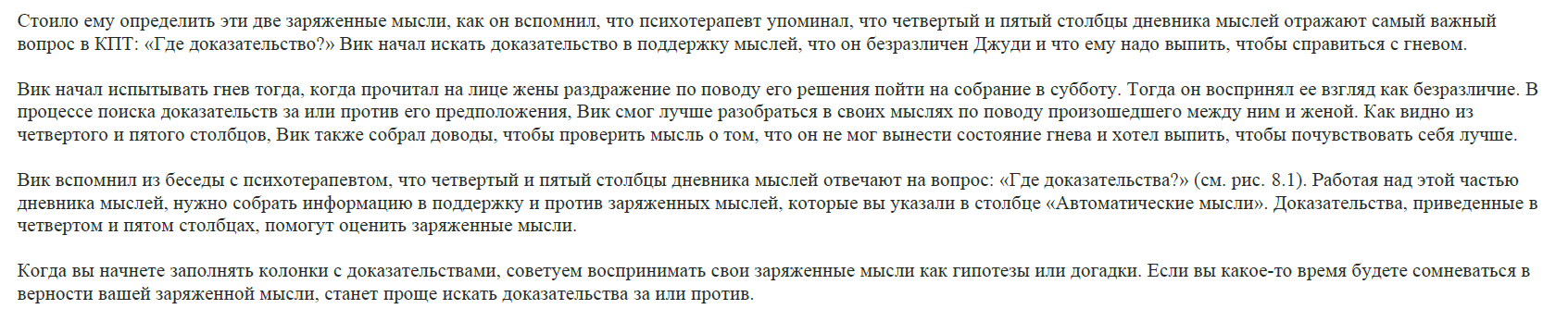 >>758481 >Не знаю, меня вроде учили опровергать, но это давно было. Плохо когда не знаешь, да еще забудешь. >Опровергать или оценивать - суть претензии это не меняет Ты говоришь, что >Моя проблемы с КПТ такие >после нескольких тетрадей заполненных опровержениями мыслей но вот, например, в пикриле из рандомной книги по КПТ с моего жесткого диска почему-то ищут ещё к тому же подтверждения мыслей. Ненужная хуета? Лишние детали? Как не меняет суть претензий к КПТ, если ты занимаешься НЕ КПТ? То есть что-то вроде карго культа. Ну чуть лучше. Но всё равно хуйня. >Ты можешь интеллектуально осознать что твои мысли не имеют под собой рационального основания Всё знаешь, всё понимаешь, но ничего не можешь. Какая жалость. >После опровержения этих мыслей Да блять, опять что ли. По-моему это аутотренинг называется, а не КПТ. >изменении самой тенденции Рекомендую диамат. Надежный, как швейцарские часы.