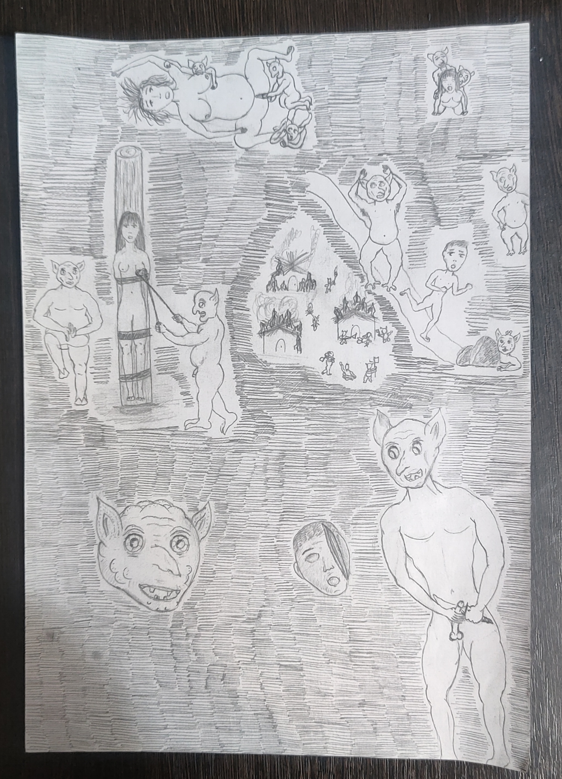 Рисовал крипи картинку. Перед работой нарисовал кровать, которая ну просто большой прямоугольники несколько прямоугольников поменьше. Слабо, не нравится. После работы приехал, покачал бицуху резинкой и гирями, рисовал толстяка с вспоротым животом. Получилась хуйня, сиськи и живот хотя бы забавные, и ноги тоже имеют свой прикол, но лицо совершенно не нравится да и сама голова в целом, кишки вообще молчу, просто насрали в живот. Правда это все же черновой вариант, да и карандаши у меня остались только ублюдские, которыми невозможно рисовать, они тупо мнут бумагу, ещё и заточить их невозможно, надеюсь, получится перерисовать получше.