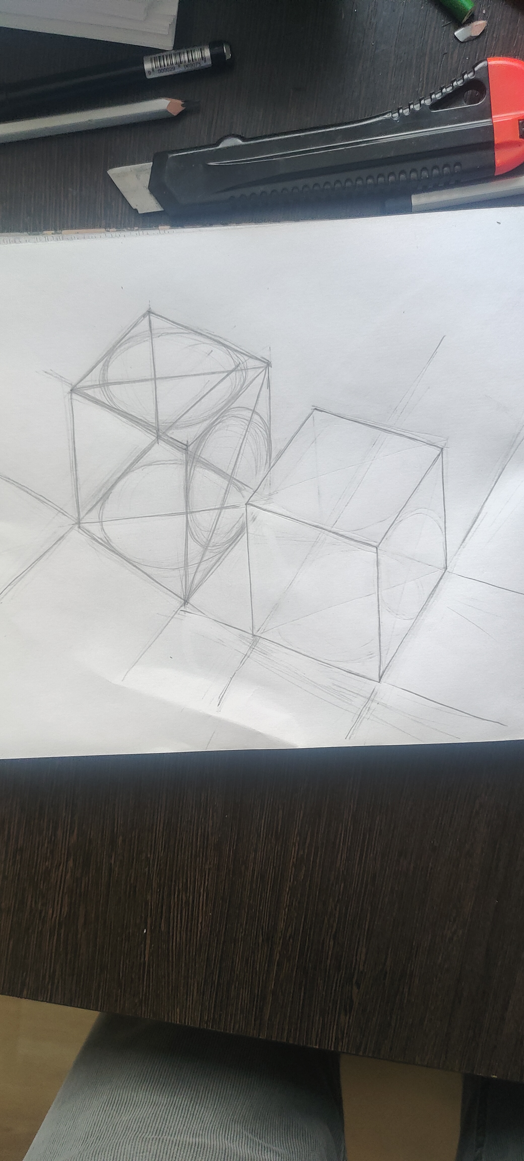 >>841878 Линии на нижней плоскости ты насквозь рисуешь, а на верхней только по граням куба, надо как и на нижней, чтоб понимать куда они там сходятся. И у тебя на удивление очень правильный подход к упражнению, в 99% люди неправильно это делают. Правильный в смысле - рисуешь линии жирно и смело на вылет, и эллипсы накручиваешь внутри. Если че надо рисовать прям с реального куба, а не из головы. Для начала можно сделать каркас куба, чтоб видеть все грани.