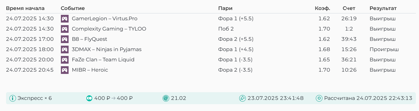 Четко предсказал >>805733 Все зашло К сожалению я как-раз подрезал средства расходуемые на экспрессы, так бы озолотился. Но неплохо-неплохо, +6к, и если завтра Виталити c форой -5.5 победит то капнет еще 8к с экспресса за 300 рублей. Я думаю победит, Монголы осилили Фальконс только потому что там два лучших игрока на жопе ровно сидели и ничего не делали.
