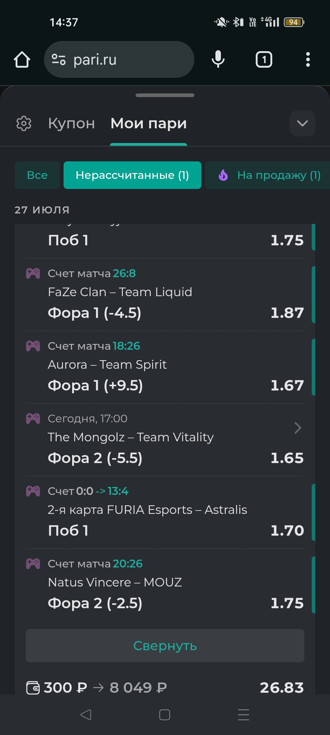 Лудоапдейт В игре были 3000 рублей. Во-первых, я решил что от ставки на Монголов нужно избавляться. Не за то братва погибала в 90е чтобы ставить на сторону которая я уверен проиграет. Хотел выкупить ставку свою 750 рублевую, но бетбум предложил 650. Минус моих пролетарских 100 рублей! Я решил так, да Монголы просрут, но они вполне могут взять пистолетку. Они взяли. Ну раз они выиграли пистолетку, то верятно они и следующий раунд заберут. Да, забрали. После этого я сразу же скинул ее за 900 рублей. Надо ли говорить что Виталити далее разгромила Монголов 2-0 поэтому те позавчерашние 300 рублей превратились в 8000 После 900 рублей умножил на два поставив на нави в лайфе чувствуя что у фейзов нету шансов.