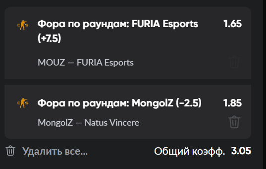 С экспрессами надо тоже подзавязывать. Был турнир где они отлично залетали, но сейчас полный провал (особенно из-за включения туда матчев рпл). Лучшие ставки в лайфе, но тут надо время тратить на отслежку. Завтра нужен 2:0 от Маузов. Это даст мне 5к, в дополнение к этому победа спирита подкинет еще 3к. Если оба события заходят то я останусь на 2 тыщи в плюсе и могу ставить дальше, если нет, то я на 6к в минусе и до следующих фрибетов на этом все.