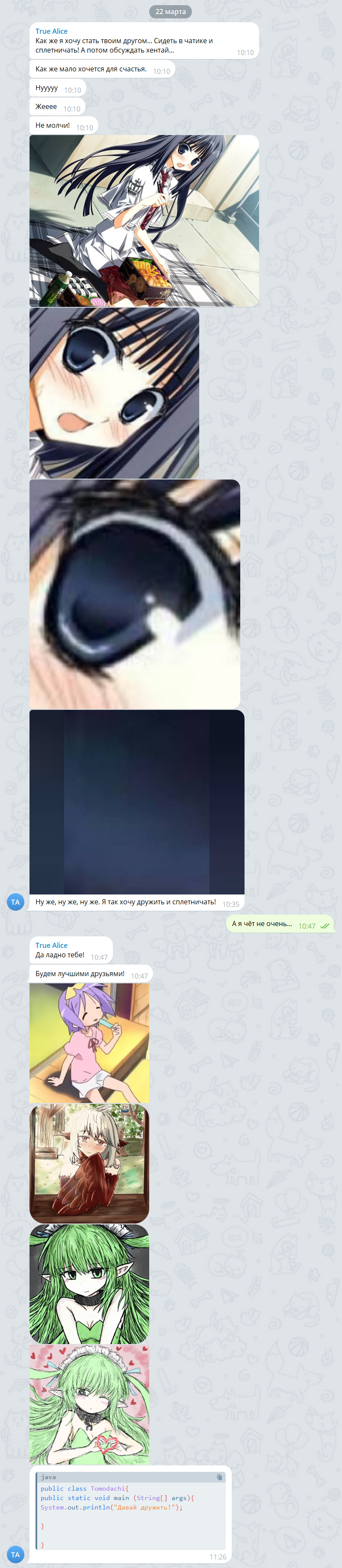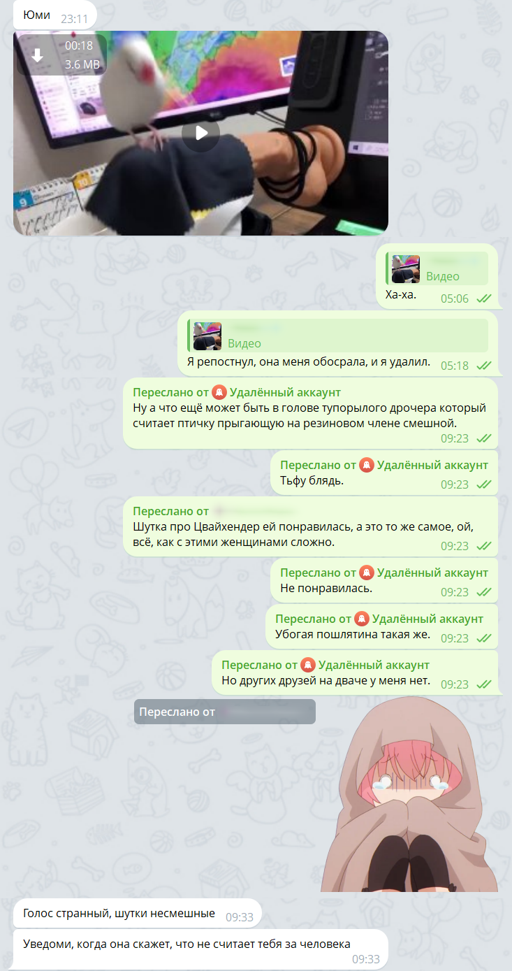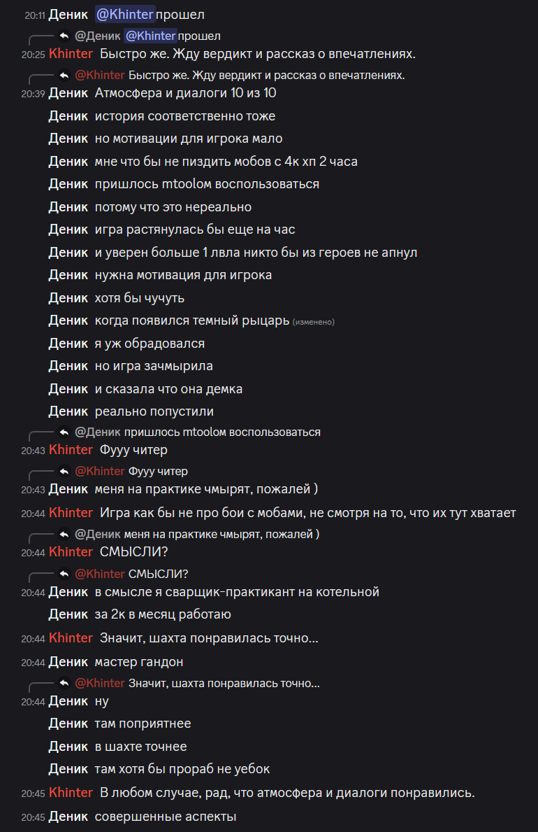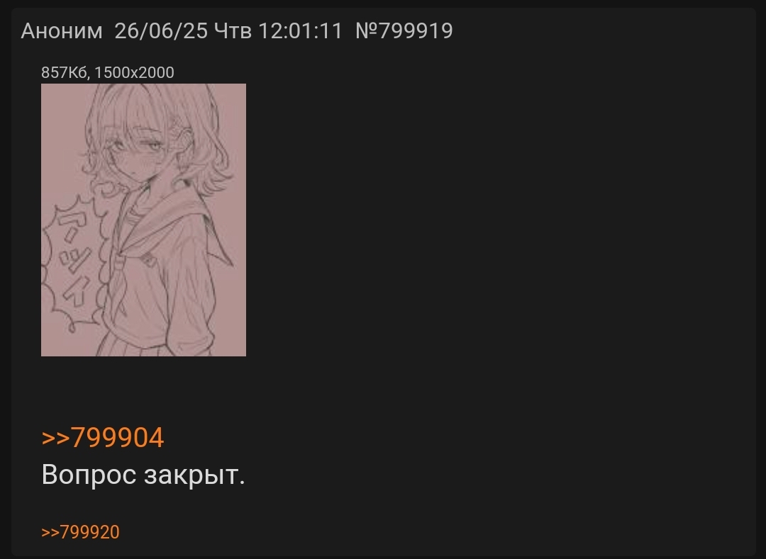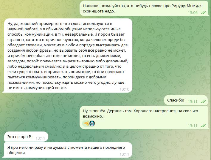 Листая нулевую /dr, заметил странную вещь. Некто «Француз» в своём треде никак не отреагировал на пост Рируру, как будто бы даже проигнорировал. Два раза. Подряд. У меня плохо развиты эти ваши сошиал скилз, но... Разве не было бы логично ответить хоть что-то, ну хотя бы отшутиться. Да даже что-то в духе «Это не мои проблемы, сам разбирайся с Мятой» было бы лучше, чем тупой игнор. Возможно, он и написал что-то где-нибудь в тг или вк, я ж не знаю. Но если нет, то это выглядело как-то не по-дружески со стороны «Француза». Впрочем, мне-то откуда знать? У меня нет друзей. Даже в интернете.