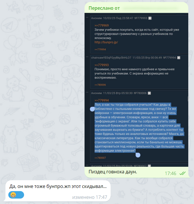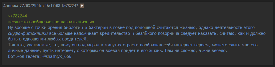 Я бы вообще не думал, что это ты, потому что в каком-то треде ты звал его к себе, а, вспомнил: >>775032 →>>775060 →, и, типа, было бы как-то странно звать самого себя, но его претензии сильно похожи на твои и сильно не похожи ни на что другое.