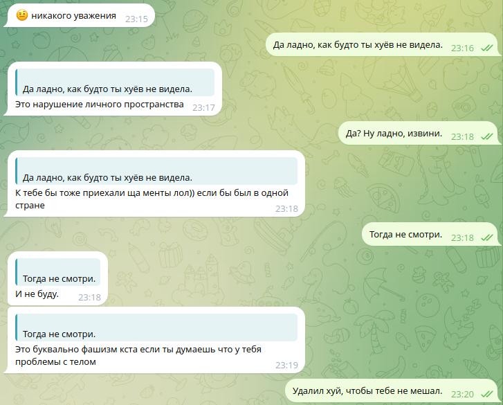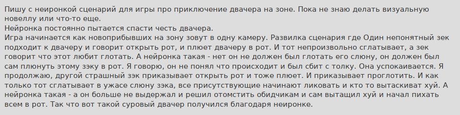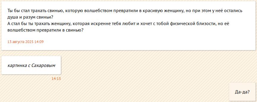 Должно, если это ты, то у меня возникают вопросы, в первую очередь, что едят правильные пацаны вместо ВКУСНОЙ ЕДЫ (известно, что: >>644764 →, но вдруг нет), а если это не ты, то какого хуя ты этого чмошника поддержал (тоже известно, какого: >>755656 →, но вдруг нет), ну и можно было бы ради интереса задать тот же вопрос насчёт еды, как к поддержавшему. Типа, художник должен быть голодным (в любом смысле)? Полная хуйня с единственной целью позволить убогим думать «зато он голодный».