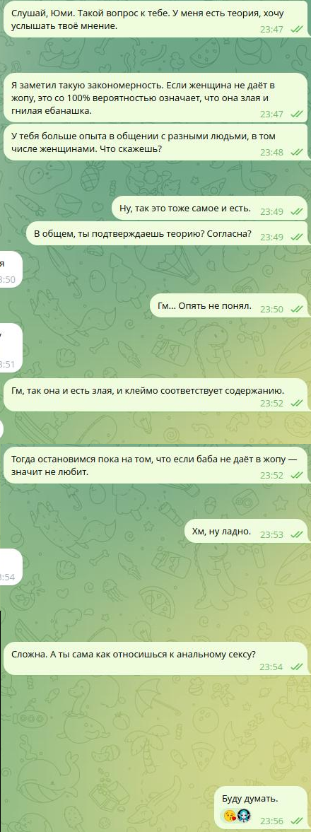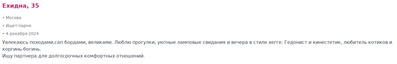 + 3 балла если тян не либераха. Под «либерахой» имеется в виду собирательный образ русофобов, ксенофилов и адептов любых идеологий, в основе которых лежит принцип «будь врагом своему Отечеству». Но это также не означает, что она должна быть так называемой «охранительницей» — во всём поддакивать чинушам и рассуждать по принципу «своё говно не пахнет».