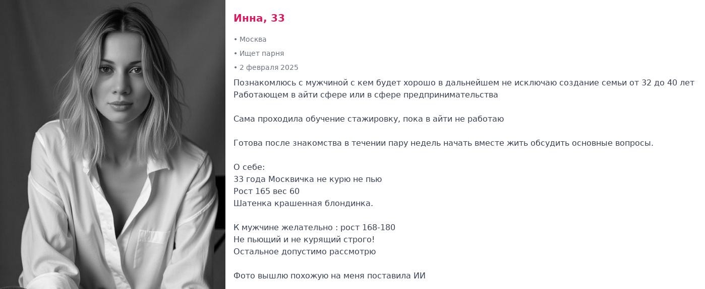 Рассматриваются только тян от 30 до 45-ти. Зумерши сразу мимо.
