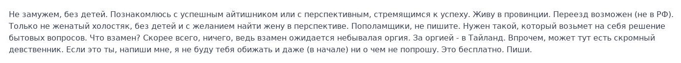 Для чистоты эксперимента закинул свою анекту в soc. Как видите, я не против романтических отношений с женщиной и создания новой ячейки общества. Это не моя вина, что в мире не нашлось для меня второй половинки. Теперь могу со спокойной душой до старости дрочить в носок, и вы не имеете права меня осуждать.