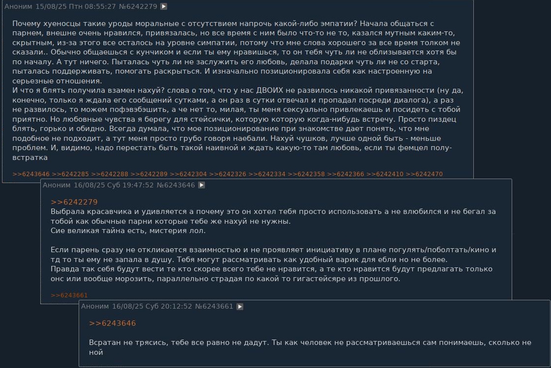 >к 30+ устроены в жизни, нормально социализированы и состоят в стабильных отношениях, ну или им уже нафик не упало есть говно искать родственную душу в соц/на сз/хз Всё так. Да, устроены, да социализированы, да я им нафиг не нужен. Блэкпилл. Других вариантов нет. О чём и был пост выше.
