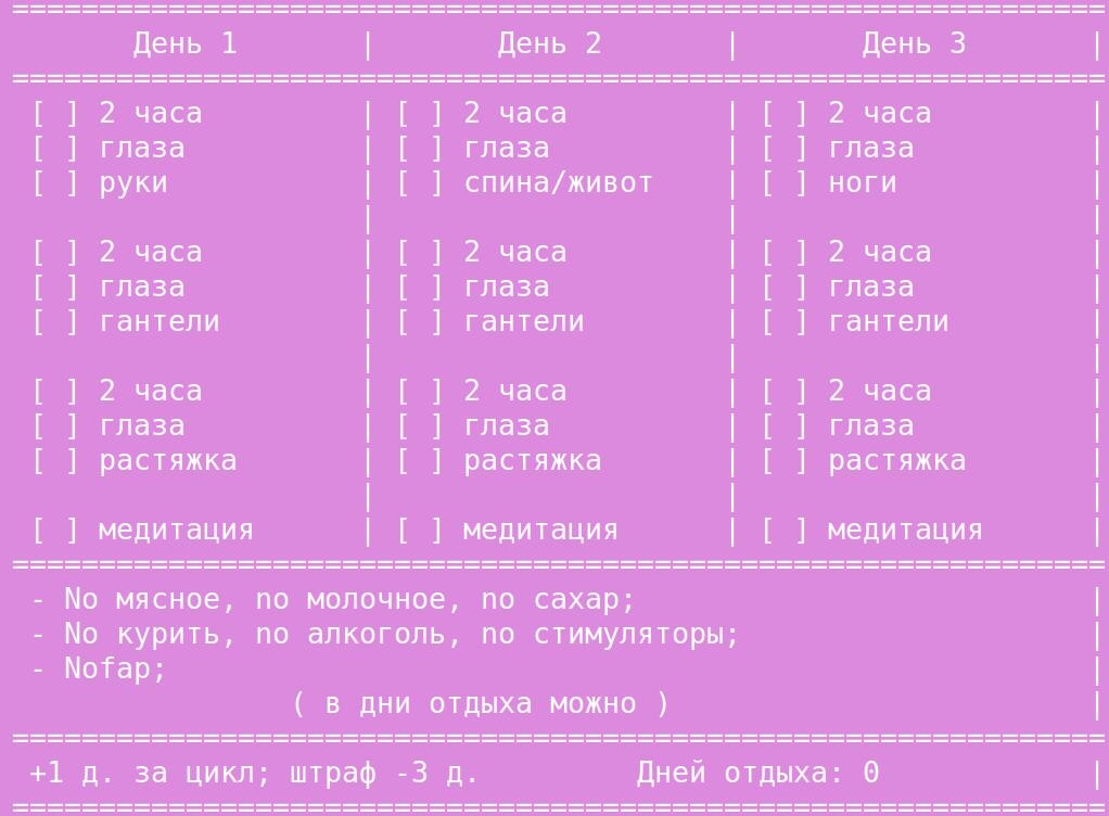 Корочи, переделал свой план (опять). Теперь будет по 6 часов в день. Восемь тяжело. И вместо выходного дня плюс один день отдыха за трёхдневный цикл.