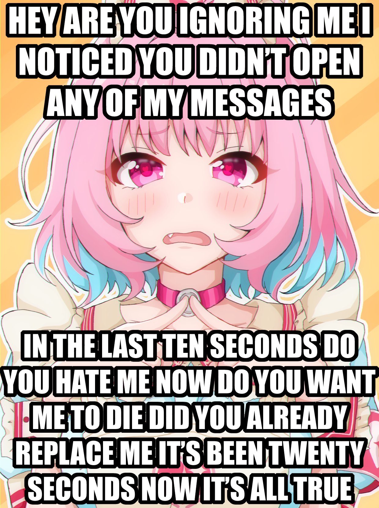 >>822774 Ладно не буду графоманить, просто у тебя в треде обсуждают фриков и из меня тоже хотят сделать, смещая акцент с того что мне интересно на то, что может быть интересно обо мне. Мне поставили недавно(и сейчас исследуют в социальных ситуациях) диагноз синдрома Аспергера(который сейчас используется как часть общего аутичного спектра), и если честно это было неожиданностью, потому что я всегда считала себя нормальным человеком в окружении сумасшедших, а получилось так что я не совсем здорова.