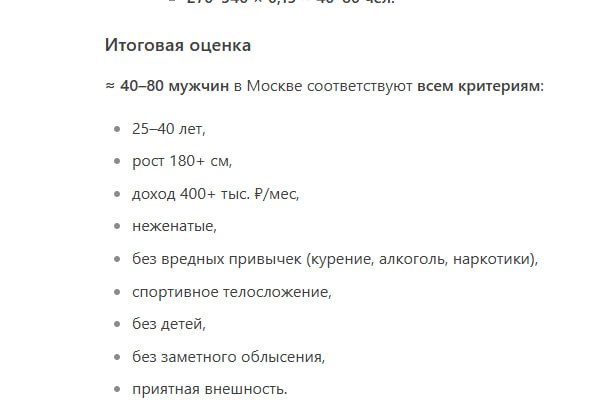 Наткнулся на завирусившийся пост где у чатгпт спрашивают сколько мужчиков в мск 25-40 лет неженатых без вредных привычек и с доходом от 150к. Забил критерием свои параметры в дипсик. Вышел пикрелейтед. Ну и где мой ежедневный секс? Конечно думаю что это все вранье, не ощущаю себя гигачадом глядя по сторонам в метро.