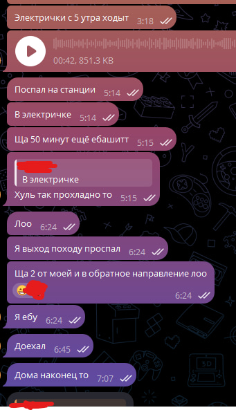 p.s. рубрика возвращение домой пик5 это отдельный рофл: пошел к станции взял роллы в вв, пошел назад, потом опять к станции, там час сидел (поспал) потом сел в электричку и поспал, оказывается доехал до своей и она уже отъезжать начала проснулся, когда она съебала на 3 станции от дома, вышел, а утром все основные в москву стоял ждал 10 минут, сел и домой замерз пизда
