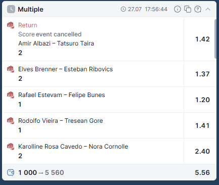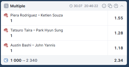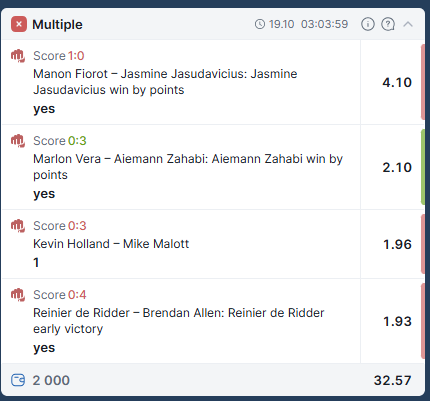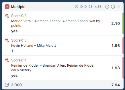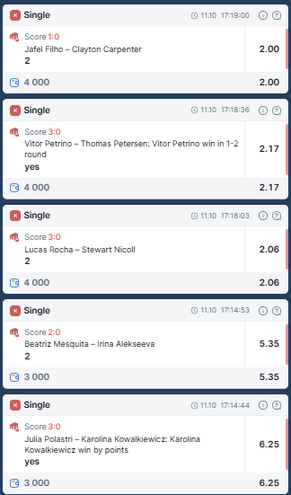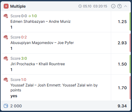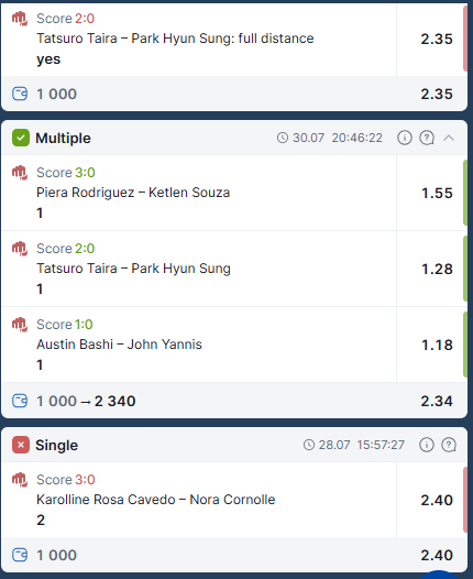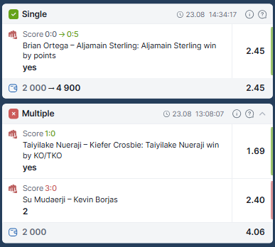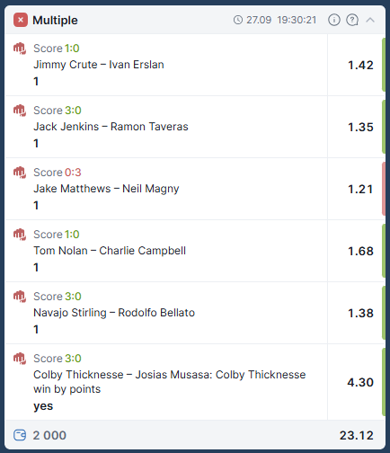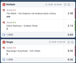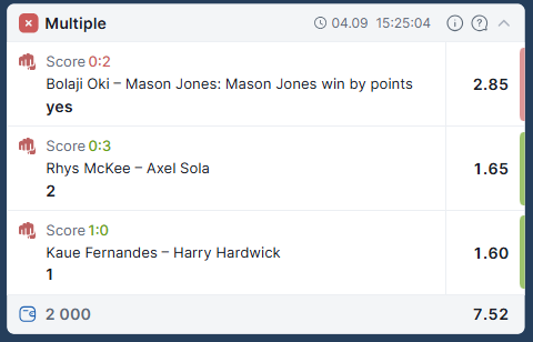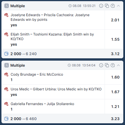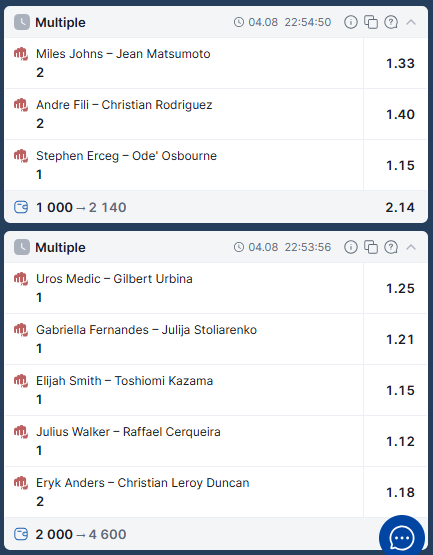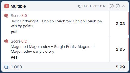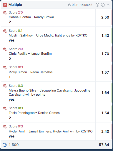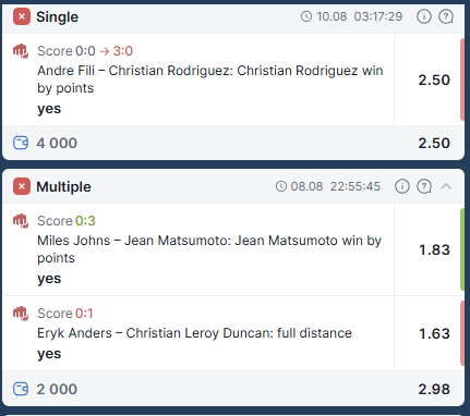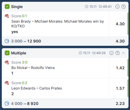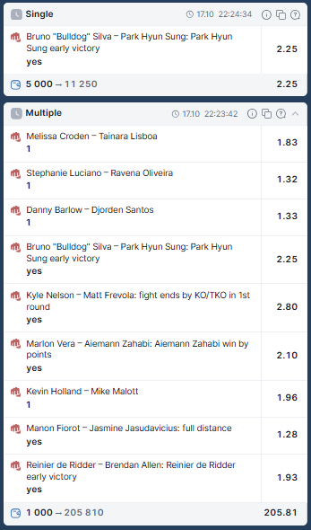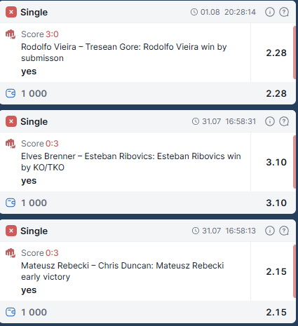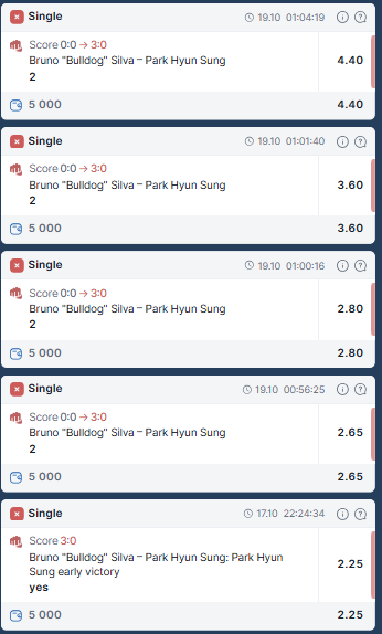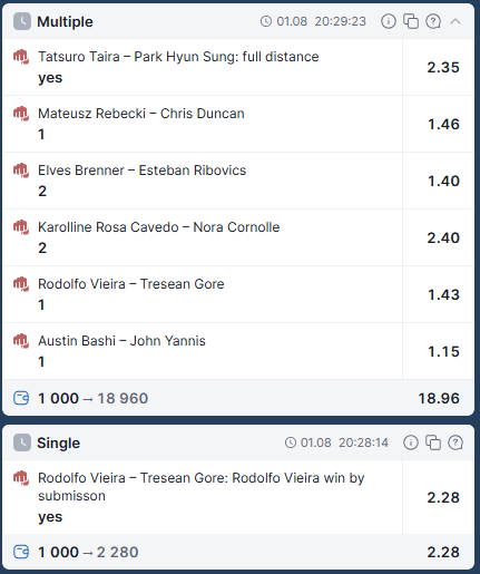 Последние 2. Виера просто хороший джитсер, что знает как использовать свою массу, особенно против оппонента значительно меньше его и с историей сдач. Экспресс уже был прояснён. Теперь осталось тока денюжек на живых ставках зарядить, но это уже на ивенте. Пока я поставил всего 8к. 3 Экспресса, 4 с условиями и один обычный. Надеемся на лучшее.